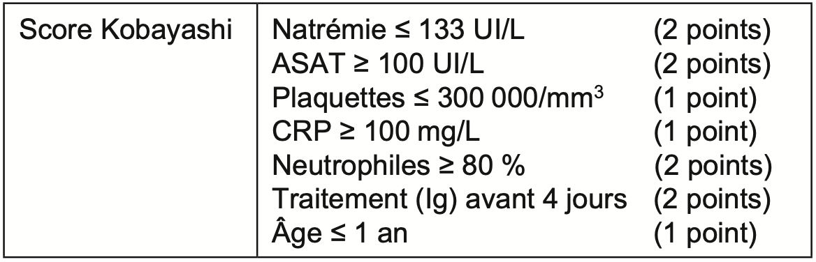 Score prédictif de non-réponse aux IgIV : score de Kobayashi positif si ≥ 5 points sur 11