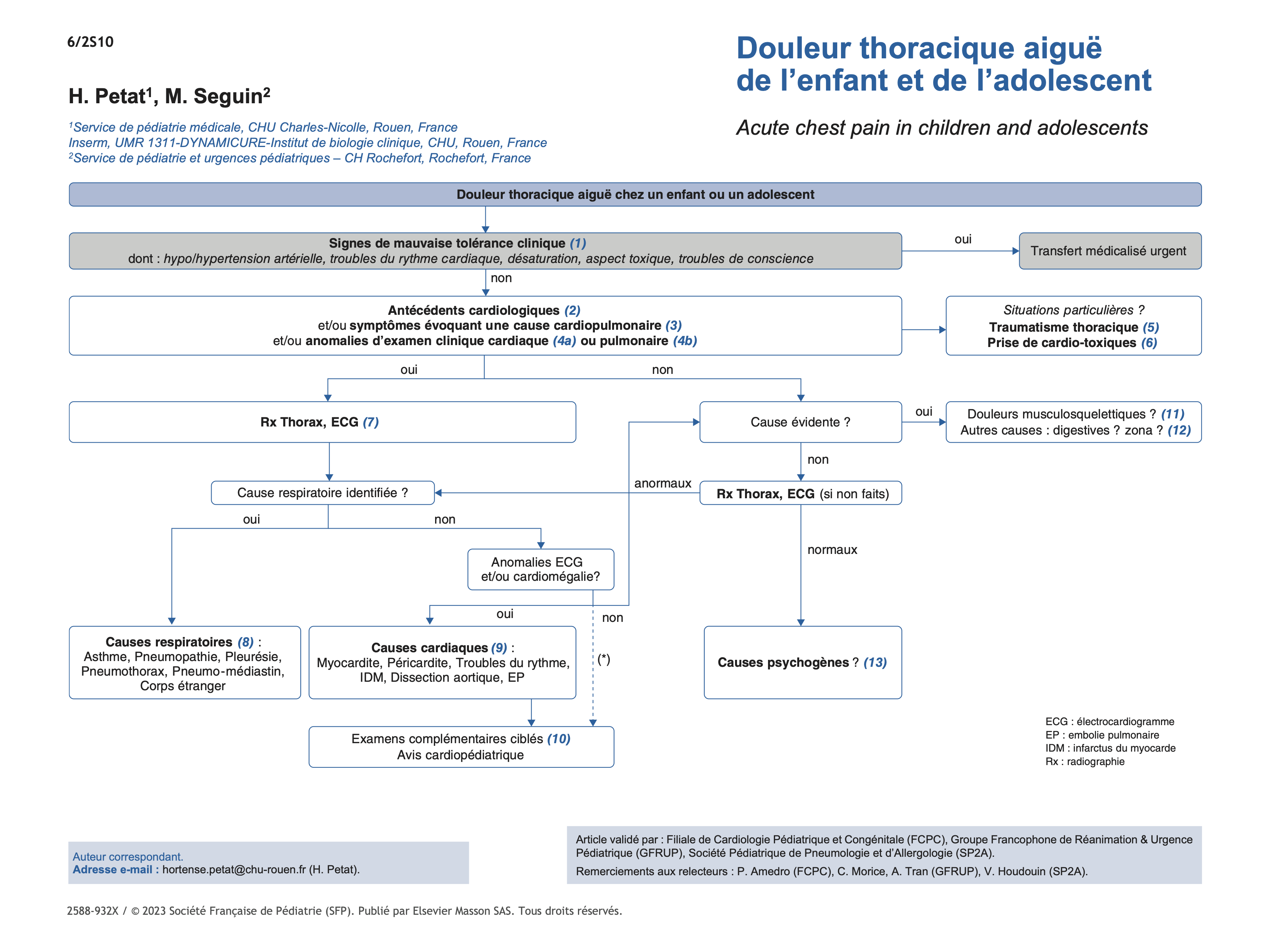 (10) En cas de suspicion d’une cause cardiologique, un avis cardiopédiatrique est nécessaire. D’autres examens spécialisés sont alors à envisager comme un dosage de la troponine en cas de suspicion de myocardite, péricardite ou ischémie coronaire, ainsi qu’une échographie cardiaque.