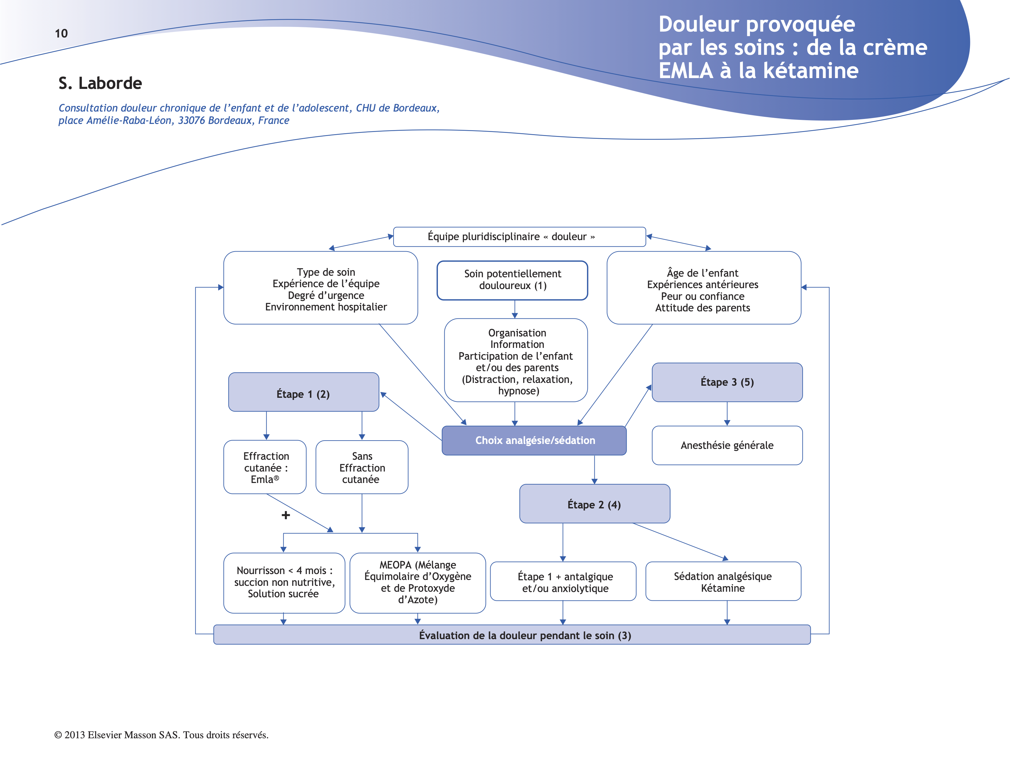 La douleur liée aux soins représente la douleur la plus fréquente à l’hôpital et en médecine générale. Ainsi, sa prise en considération est indispensable en particulier lorsque ces soins doivent être répétés. Le but est d’éviter la mémorisation de la douleur notamment dans sa composante émotionnelle [1] et l’évolution vers des comportements phobiques empêchant un accompagnement serein de l’enfant. Une prise en charge adaptée de ces douleurs permet de limiter voir de supprimer la contention en associant aux outils médicamenteux des techniques non médicamenteuses [2] qui permettront la participation de l’enfant et de ses parents (distraction, hypnose, relaxation, etc.).