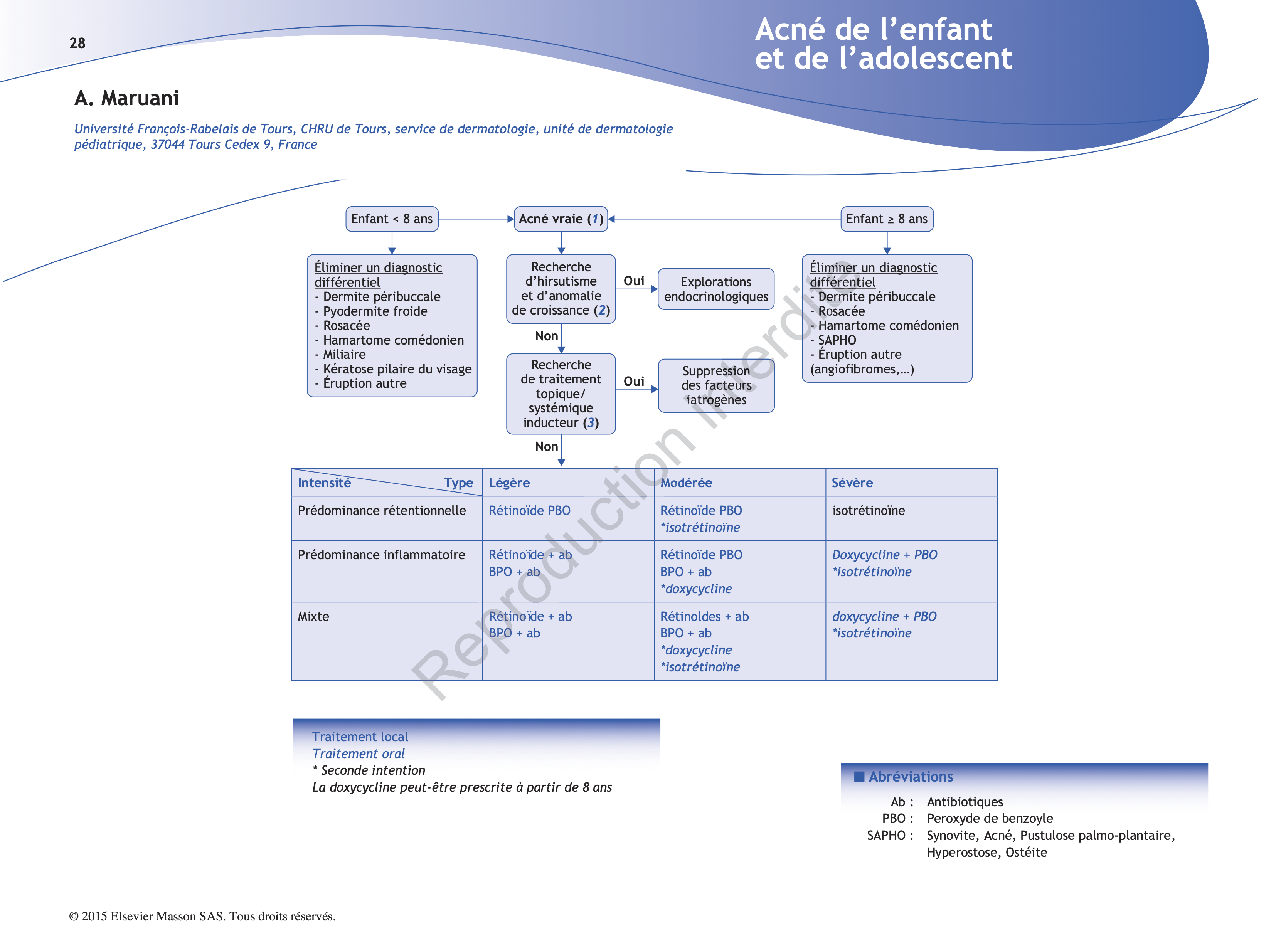 (2) Seuls les cas d’acné associée à des signes d’hirsutisme (hypertrophie clitoridienne, hyperpilosité, etc.) ou de puberté précoce doivent conduire à des explorations endocrinologiques (ovariennes, surrénaliennes, hypothalamo-hypophysaire).