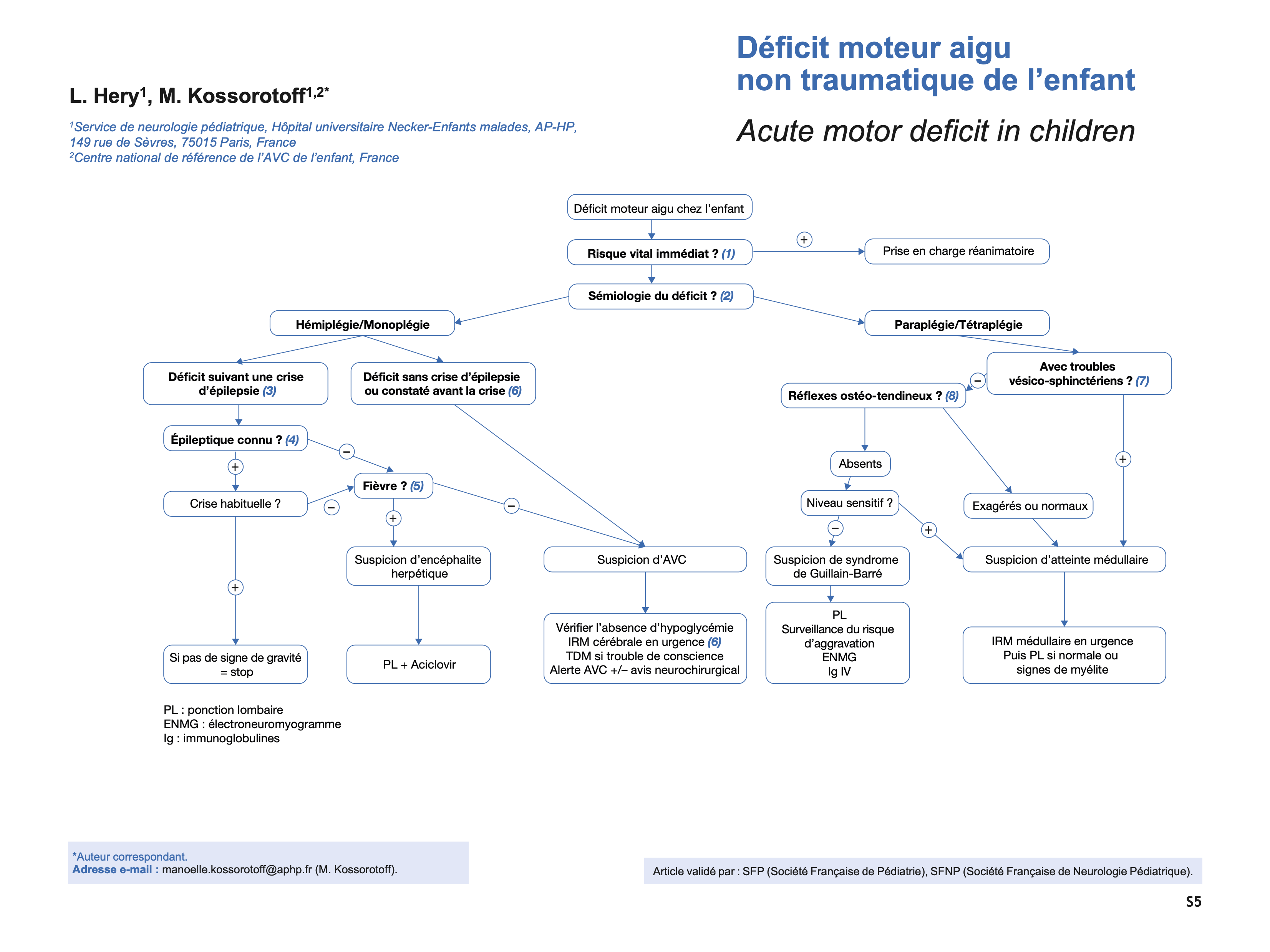 Plusieurs diagnostics nécessitent d’être évoqués en urgence, notamment l’encéphalite herpétique, les accidents vasculaires cérébraux, la polyradiculonévrite aiguë (syndrome de Guillain- Barré) et une atteinte médullaire, car nécessitant une prise en charge urgente adaptée. Leurs caractéristiques sémiologiques et une démarche diagnostique rigoureuse permettent au clinicien, confronté à un déficit moteur aigu de l’enfant, d’établir les priorités en termes de gravité et d’examens complémentaires à réaliser pour la meilleure sécurité et prise en charge du patient.