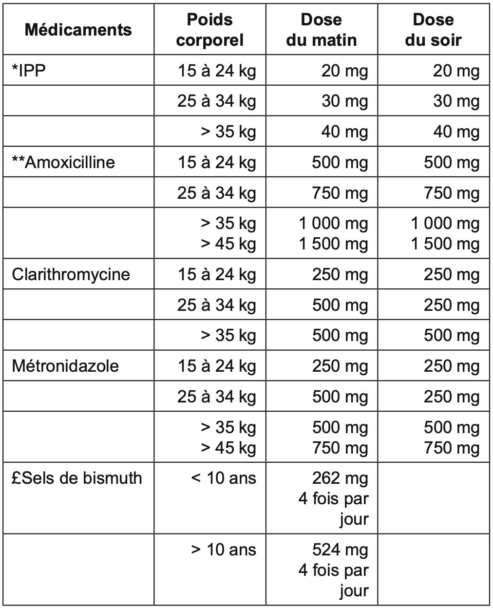 Les doses d’IPP et d’antibiotique dépendent du poids de l’enfant, voir tableau 1.