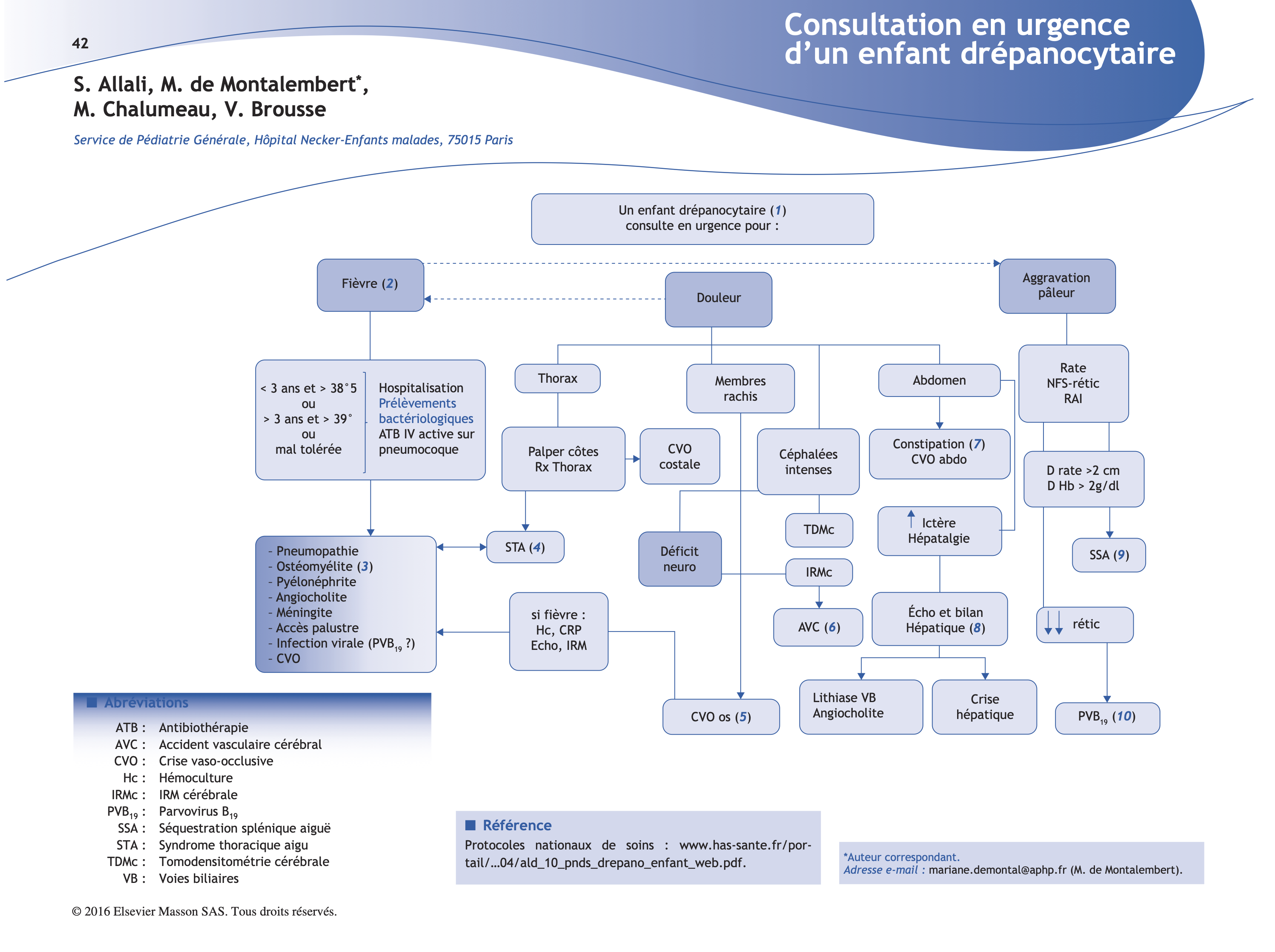 (2) Les infections fulminantes à germes encapsulés (pneumocoque avant tout) sont la première cause de décès chez les enfants drépanocytaires. Elles sont surtout fréquentes chez les petits enfants, d’où la règle d’hospitaliser tout enfant âgé de moins de 3 ans ayant une fièvre > 38,5° même si ce seuil arbitraire peut paraître discutable. On réalise une évaluation clinique, avec recherche de signes de sepsis sévère, puis une NFS avec chiffrage des réticulocytes, un dosage de la CRP, une hémoculture, un ECBU et une radiographie de thorax. L’antibiothérapie probabiliste doit cibler le pneumocoque et est administrée par voie parentérale. Cette recommandation s’étend aux enfants plus âgés avec une fièvre >39 ° (seuil là aussi arbitraire) ou avec une altération de l’état général. Une fièvre < 38,5° chez un enfant de moins de 3 ans et < 39° chez un enfant de plus de 3 ans ne justifiera pas nécessairement une hospitalisation, en l’absence de signe de mauvaise tolérance, mais nécessitera une consultation urgente et le plus souvent une antibiothérapie orale par amoxicilline. Un retour récent de voyage en zone impaludée devra être systématiquement recherché à l’interrogatoire. Une infection peut se compliquer d’une aggravation de l’anémie ou de l’apparition d’une crise vaso-occlusive (CVO).