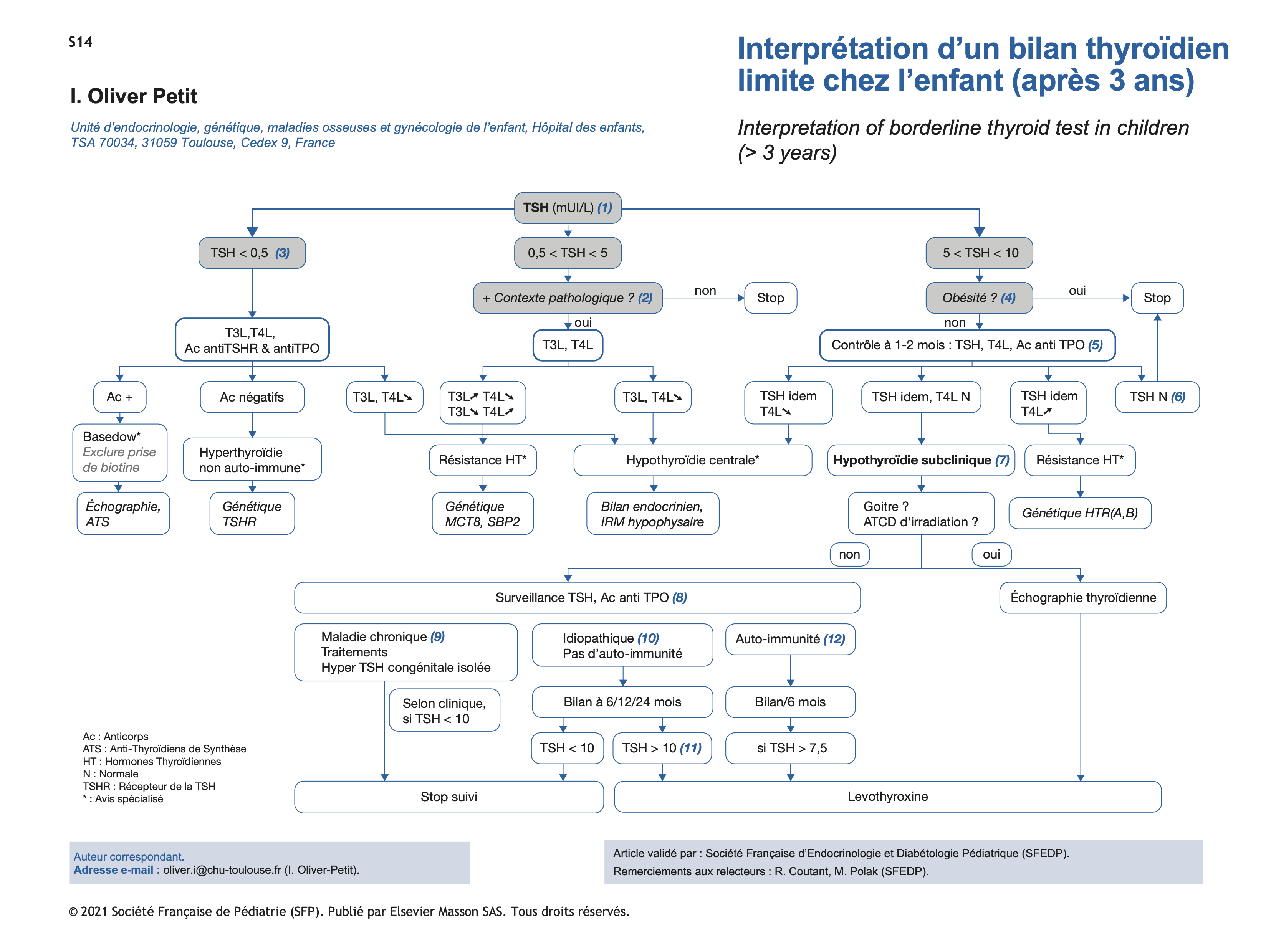 Les signes d’appel des dysthyroïdies sont souvent peu spécifiques chez l’enfant, en dehors de l’existence d’un goitre et du retentissement sur la vitesse de croissance staturale. La prescription d’un bilan thyroïdien pour une symptomatologie isolée (un seul signe ou symptôme) et peu spécifique (fatigue, frilosité, prise de poids) doit être évitée. Trop de bilans thyroïdiens sont prescrits en excès, confrontant le pédiatre puis l’endocrinopédiatre sollicité à l’interprétation de résultats souvent limites. Les hormones thyroïdiennes (HT) exercent une action essentielle dans le développement du système nerveux central, en particulier chez le jeune enfant, ainsi que sur la croissance : s’il est important d’identifier avec précision les situations pathologiques acquises ou congénitales révélées par ces anomalies, il faut aussi éviter les explorations et traitements non justifiés chez l’enfant. Ce document a pour objectif de donner quelques clés pratiques pour l’interprétation d’un bilan thyroïdien limite chez l’enfant après l’âge de 3 ans.