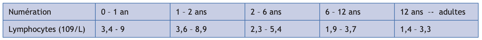 (1) La numération lymphocytaire doit toujours être interprétée en valeur absolue en fonction de l’âge (cf tableau). Les normes de l’enfant sont différentes de celles de l’adulte.