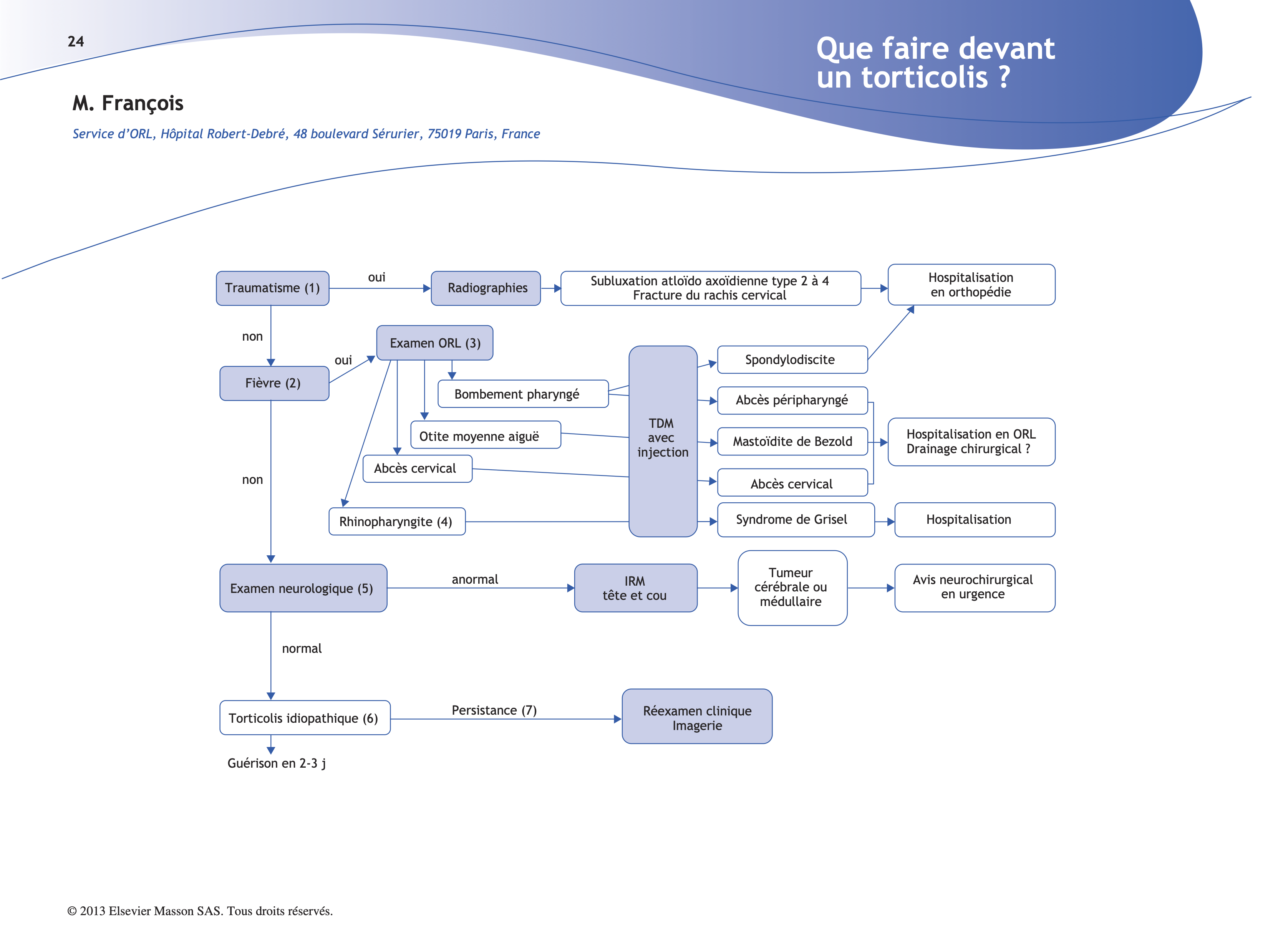 (5) S’il n’y a pas d’antécédent récent de traumatisme cervical, ni de fièvre, il faut se méfier d’un torticolis acquis révélateur d’une tumeur cérébrale ou médullaire, faire un examen neurologique et demander une IRM de la tête et du cou. Un avis neurochirurgical sera demandé en fonction du résultat de ces examens.