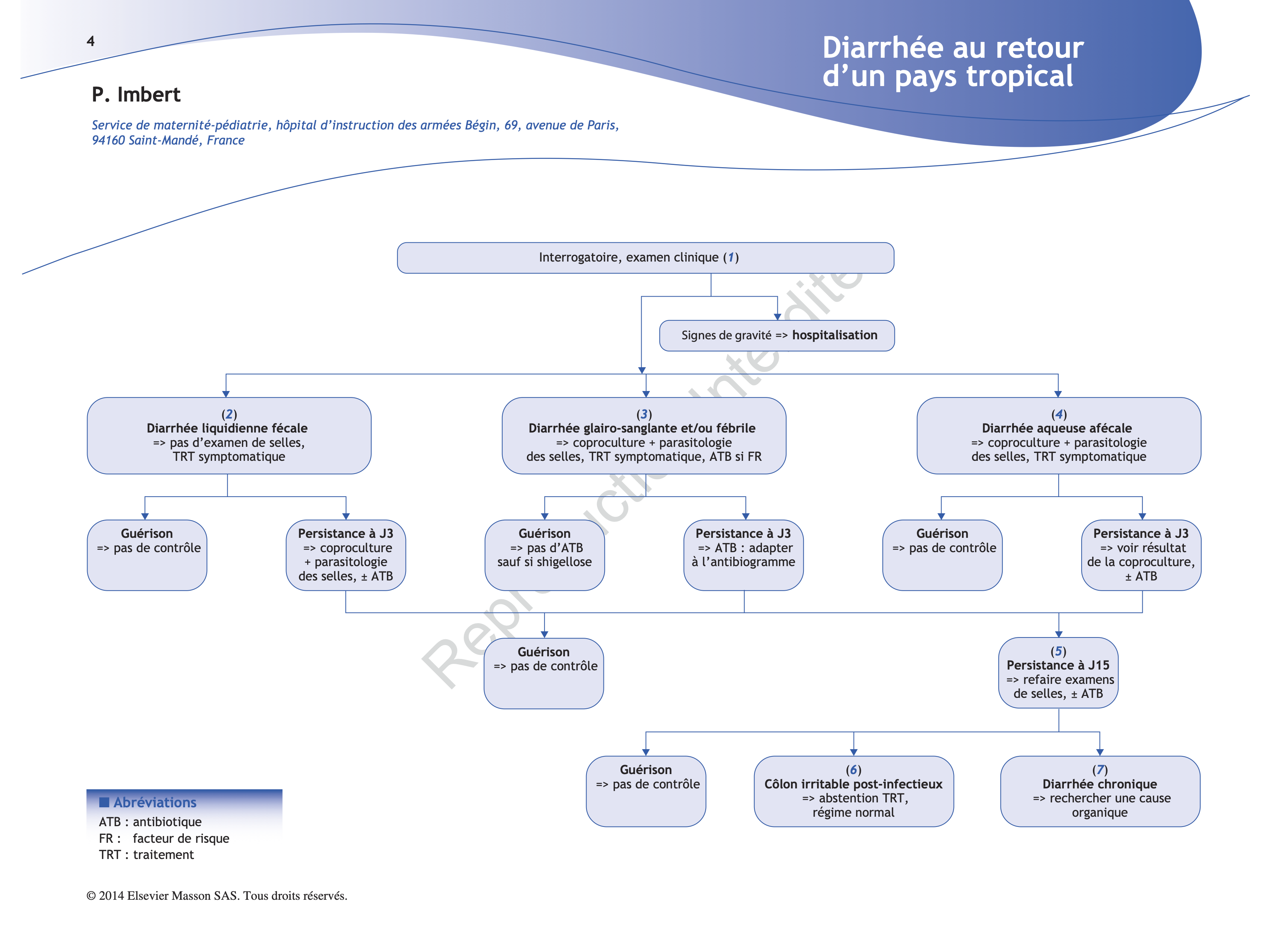 (4) La diarrhée est parfois aqueuse, afécale, ayant l’aspect « eau de riz » typique du choléra qu’il faut rechercher par coproculture, bien qu’il soit exceptionnel chez le voyageur. Une parasitologie des selles avec recherche de cryptosporidies et de microsporidies par des colorations spécifiques (bien en préciser la demande sur le bon d’examen) est toujours effectuée dans l’hypothèse d’une protozoose. La diarrhée est due habituellement à ETEC et guérit spontanément. Dans les cas intenses, une antibiothérapie peut raccourcir l’évolution. La cryptosporidiose peut se traiter par nitazoxanide. L’enfant sera revu à J3 avec les résultats de la coproculture pour vérifier l’absence d’agent pathogène à traiter.