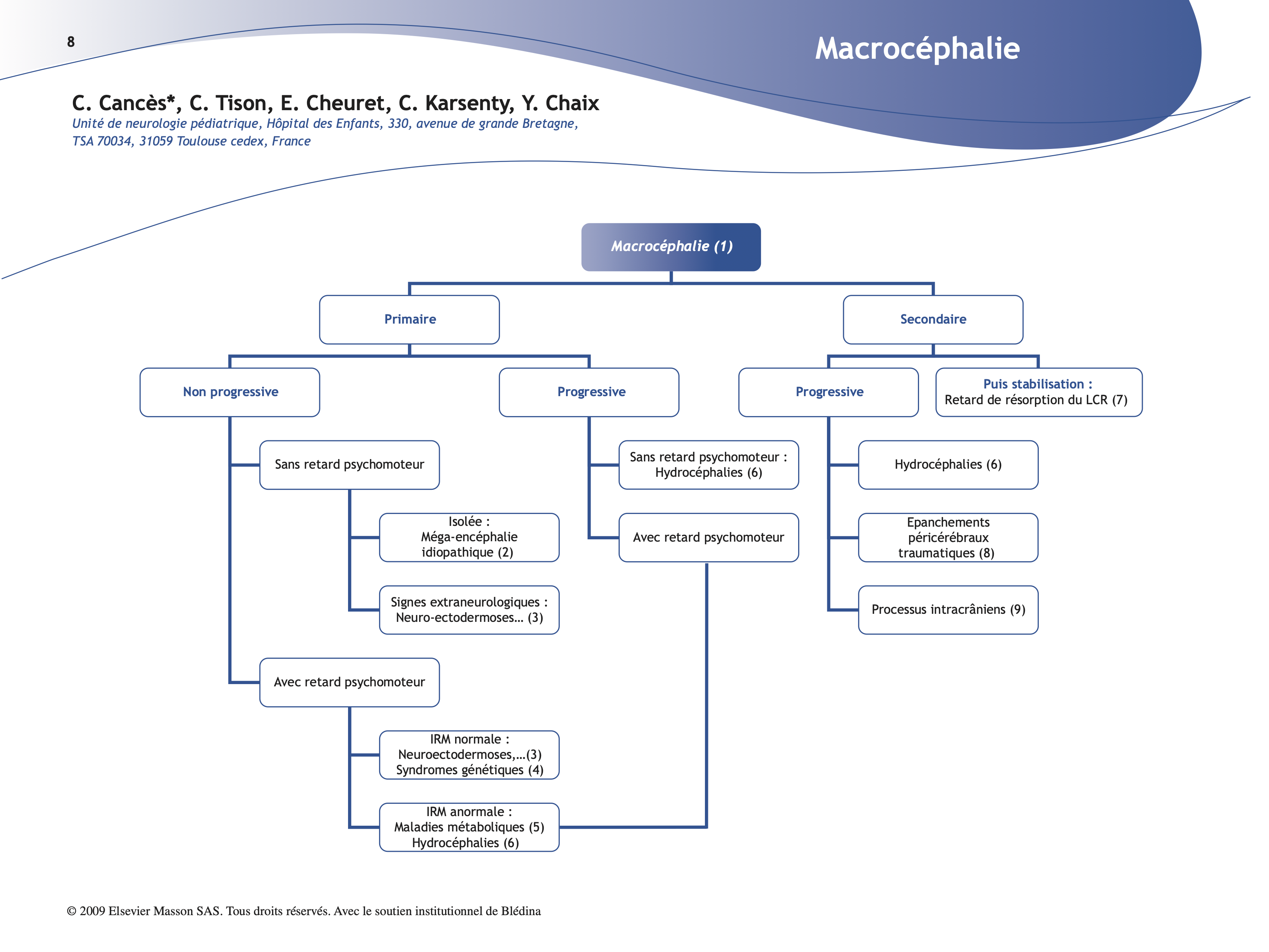 (1) Outre la mesure du périmètre crânien, son évaluation régulière et sa cinétique d’évolution permettent une stratégie hiérarchisée de diagnostic en distinguant les macrocéphalies primaires ou secondaires, progressives ou non.