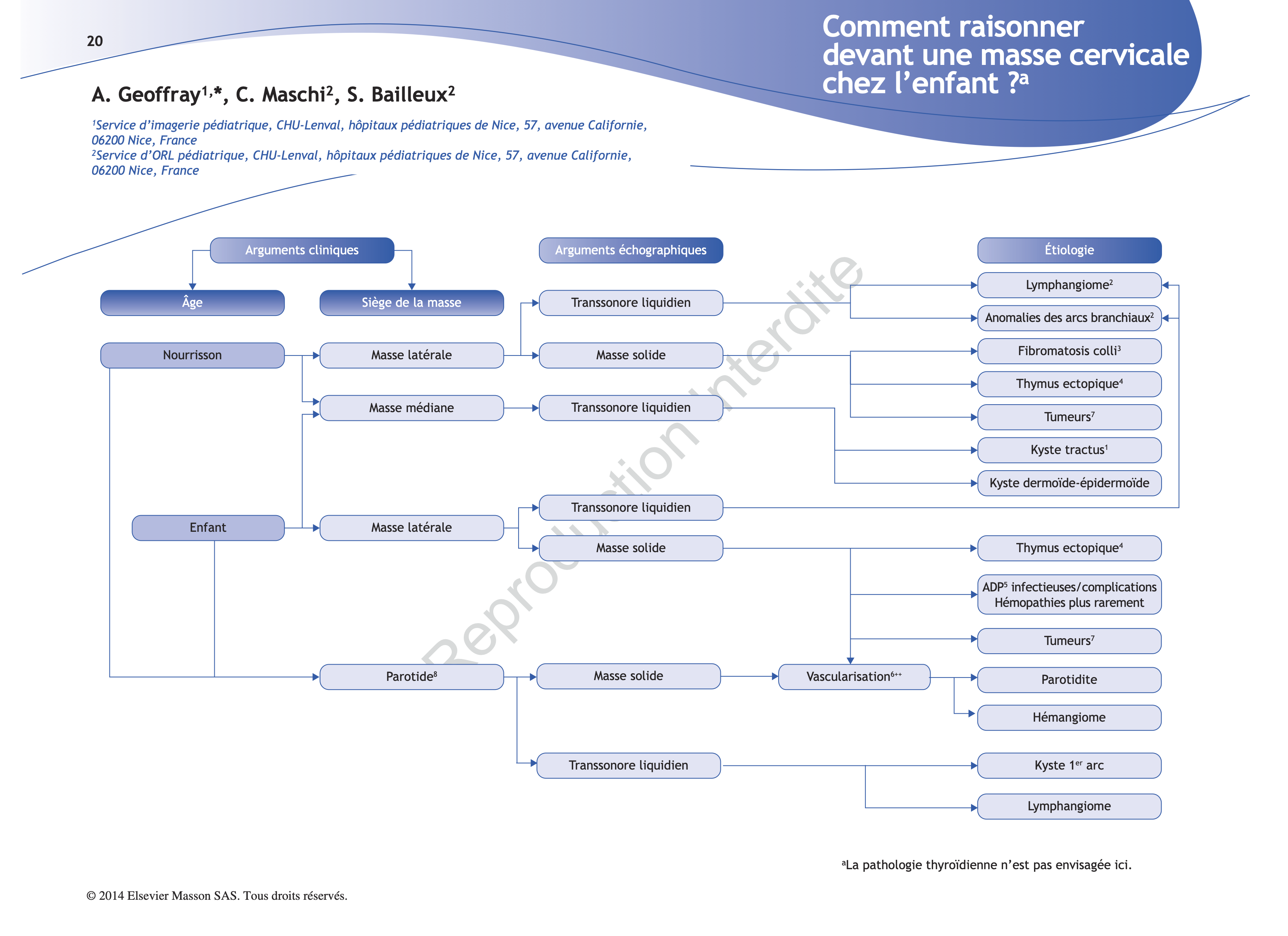 (4) Une masse souple cervicale latérale, parfois variable dans sa taille, doit faire penser à l’éventualité assez fréquente d’un thymus en situation ectopique. L’échographie est d’un bon apport, l’échostructure de la masse étant identique à celle du thymus médiastinal visualisé dans la région sus-sternale. Elle permet d’éviter le recours à d’autres examens, à une biopsie, voire à une exérèse chirurgicale, cette situation étant sans conséquence pathologique, ne nécessitant ni traitement ni surveillance.