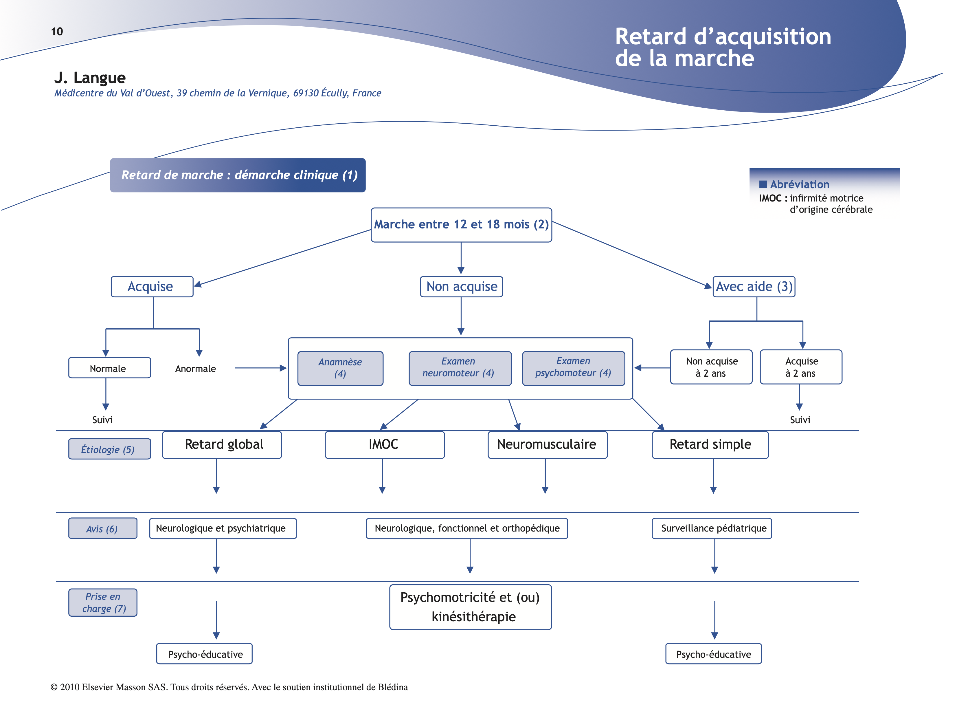 (1) La démarche proposée ici s’adresse au pédiatre généraliste dans deux circonstances : le suivi systématique d’un enfant n’ayant pas acquis la marche à 18 mois et l’examen d’un enfant vu pour la première fois en raison d’une absence de marche au même âge. Elle écarte les retards de marche dans le cadre d’une pathologie connue et la perte de la marche dans le cadre d’une affection dégénérative ou celui d’une affection aiguë.