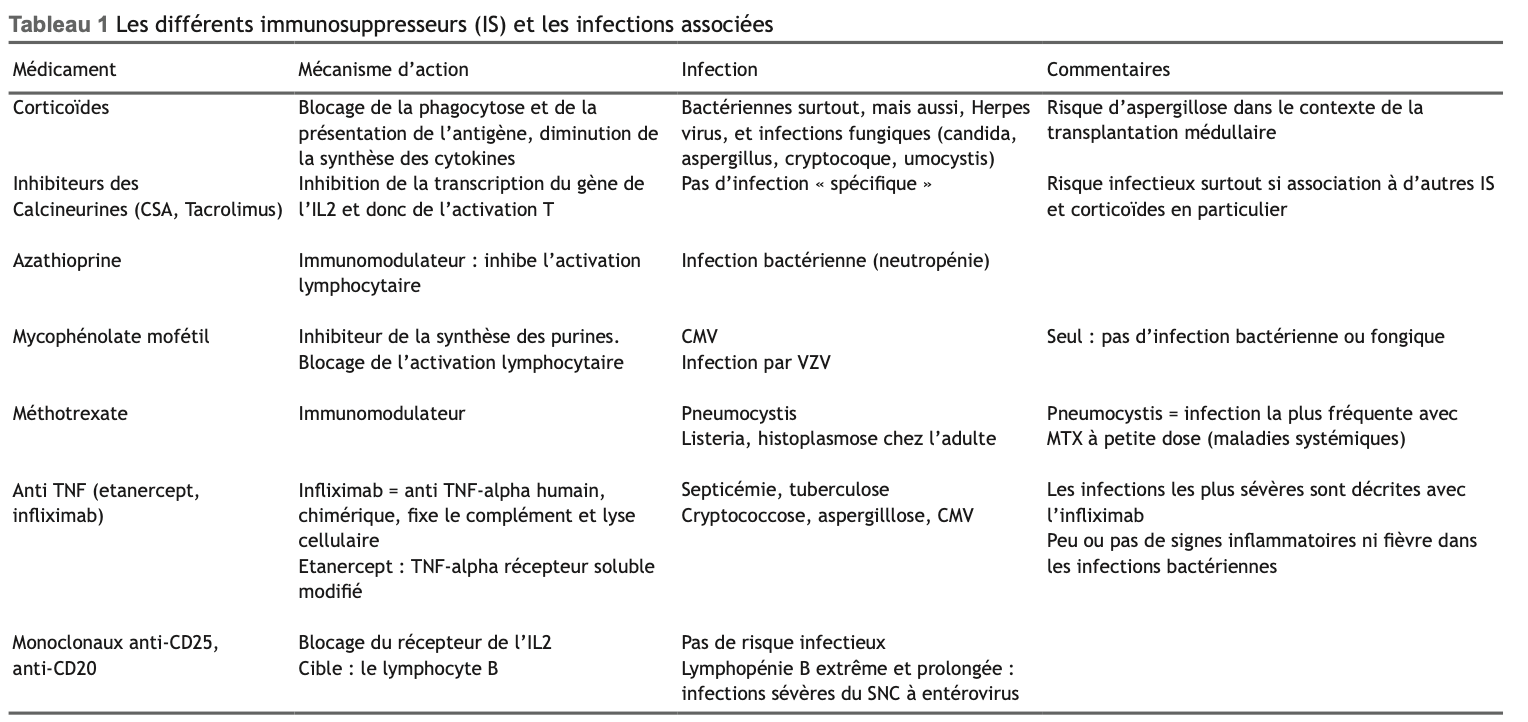 L’enfant doit être en soins intensifs si son hémodynamique est instable. Attention aux co-infections fréquentes (par exemple, CMV/infections bactériennes) et comorbidités : insuffisance surrénale d’une corticothérapie au long cours, problème d’hémostase (lupus), colonisation par bactéries multi-résistantes chez un enfant souvent hospitalisé, toxicité propre de chacun des IS (pancréatite de l’azathioprine, toxicité rénale de la ciclosporine A (CSA), diabète du tacrolimus) et de nombreuses interactions médicamenteuses (tableau 1) ;