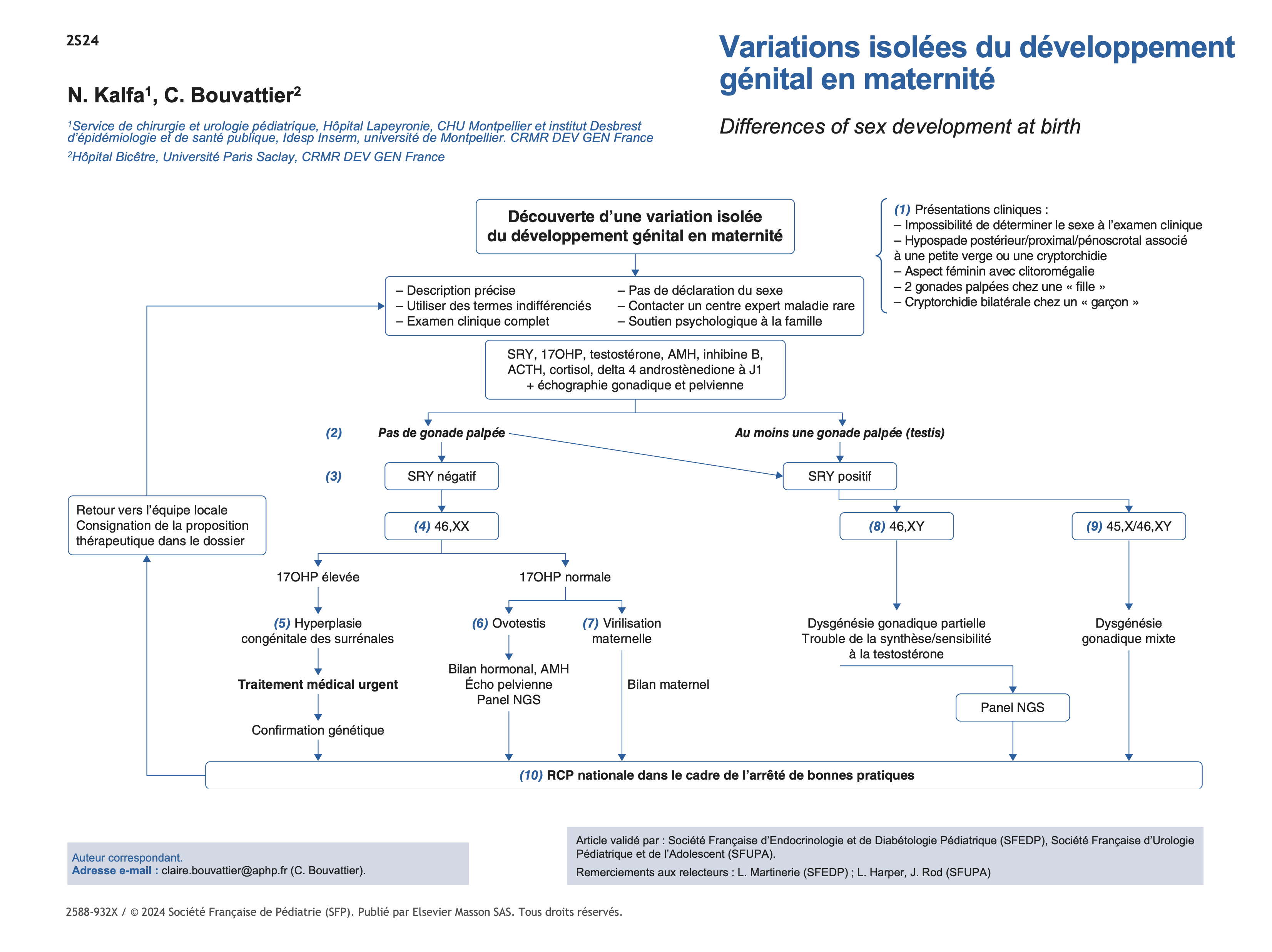 (1) La question d’une variation du développement génital (VDG) se pose le plus souvent en salle de naissance, devant la découverte d’organes génitaux atypiques comme un hypospade postérieur/proximal/pénoscrotal, isolé ou associé à une petite verge, et/ou des testicules non palpés chez un enfant d’aspect plutôt masculin, une clitoromégalie chez un nourrisson ayant un phénotype plutôt féminin, devant la palpation de gonades chez un nouveau-né au phénotype féminin ou devant l’impossibilité de déterminer le sexe par l’examen clinique. Dans tous les cas, pour les parents, la découverte d’organes génitaux atypiques chez un nouveau-né est une situation très déstabilisante psychologiquement. Le contact avec un centre expert doit être rapide pour accompagner la prise en charge. Dans un premier temps, il est parfois nécessaire de surseoir à la déclaration du sexe à l’état civil : la déclaration du prénom et du sexe doit être faite en France dans les 5 jours qui suivent la naissance. Ce délai peut être prolongé pour la déclaration du sexe, si nécessaire, par un certificat médical.