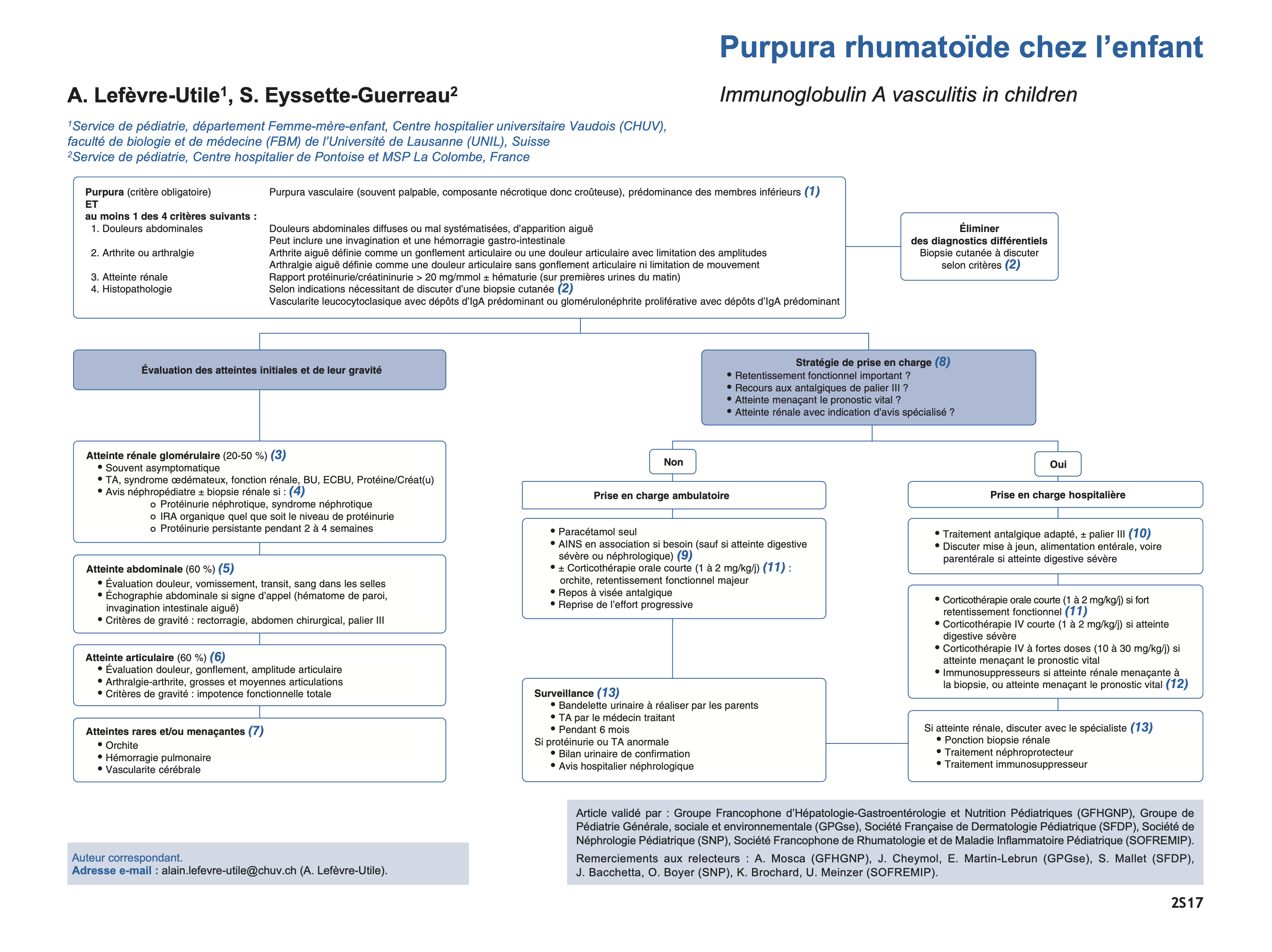 Le purpura rhumatoïde (PR) est la première vascularite pédiatrique avec une incidence annuelle proche de 20 cas pour 100 000 enfants, et un pic de survenue entre 4 et 7 ans. Les Anglo-Saxons parlent de purpura de Henoch-Schönlein, mais le terme de vascularite à immunoglobulines A (IgA) est à privilégier. Contrairement à l’adulte où la cause est souvent secondaire, elle reste en général mal connue chez l’enfant. Il s’agit d’une inflammation vasculaire systémique des petits vaisseaux en rapport avec les dépôts de complexes immuns contenant des IgA. Les principaux organes atteints sont la peau, les reins, le système digestif et les articulations. Deux des enjeux majeurs sont de dépister l’atteinte rénale et d’organiser la surveillance.