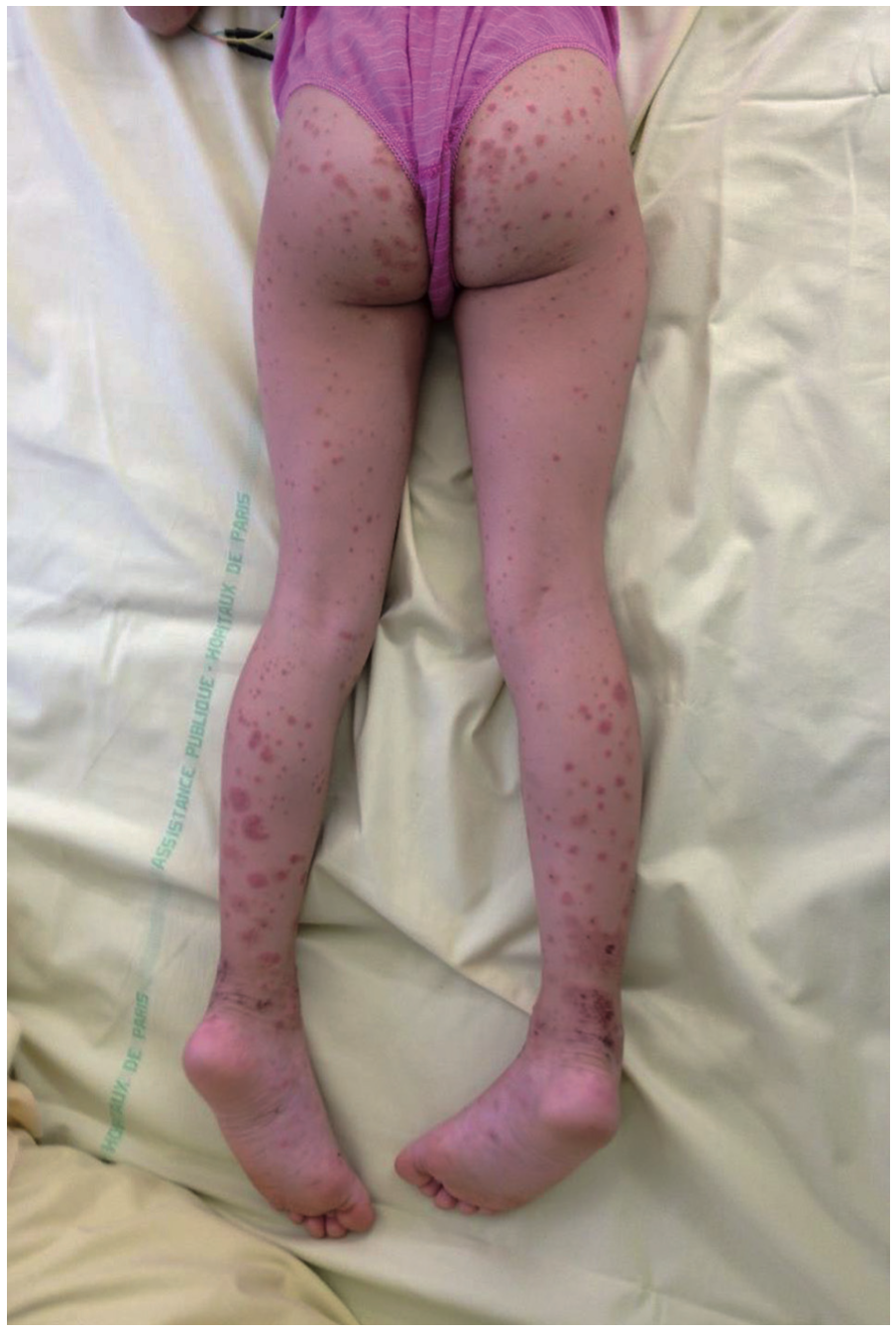 Figure 2. Éruption purpurique vasculaire avec éléments nécrotiques (infiltrés, croûteux). (photo fournie par A. Lefèvre-Utile)