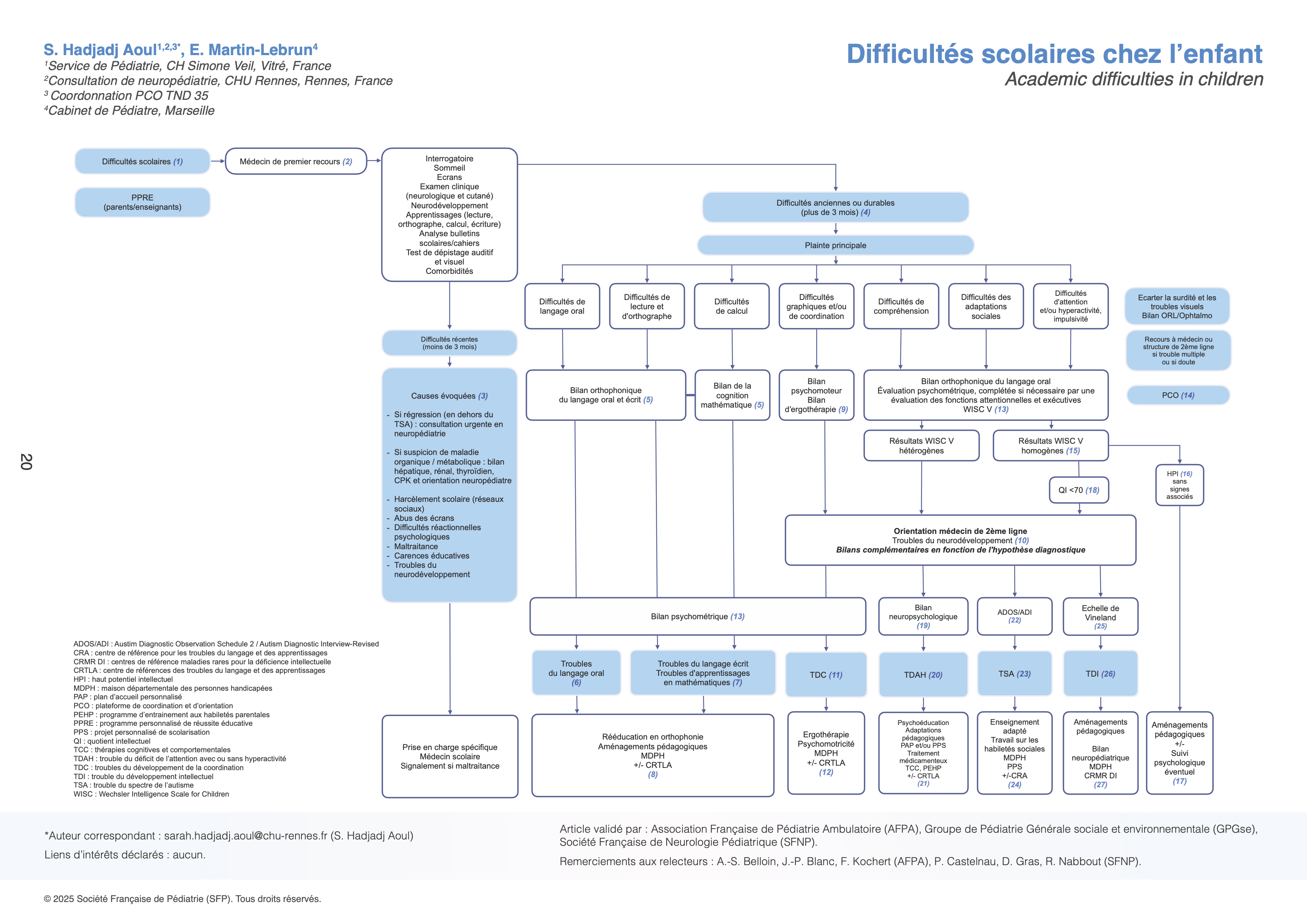 La démarche diagnostique des difficultés scolaires de l’enfant s’est enrichie en 2017 des recommandations de la Haute Autorité de Santé (HAS) sur le parcours de santé concernant les troubles spécifiques du langage et des apprentissages (TSLA), également appelés communément troubles DYS, puis de la publication de l’institut national de la santé et de la recherche médicale (INSERM) sur les troubles spécifiques des apprentissages en 2019, de la mise en place de la stratégie de prise en charge des troubles du neurodéveloppement (TND) pour 2023-2027 et enfin des recommandations de la HAS sur la prise en charge du trouble du déficit de l’attention avec ou sans hyperactivité (TDAH) en 2014 puis actualisées en 2024.