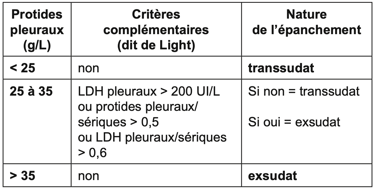 (4) Un transsudat est défini par des protides dans le liquide pleural < 25 g/L ou, si les protides pleuraux sont entre 25 à 35 g/L, par 1 des 3 critères de Light : taux de protides pleural/sérique < 0,5, ou taux de LDH pleural/sérique < 0,6, ou un taux de LDH pleural < 2/3 de la limite supérieure normale du plasma. La valeur prédictive négative est de 96 % et la sensibilité est de 98 %.