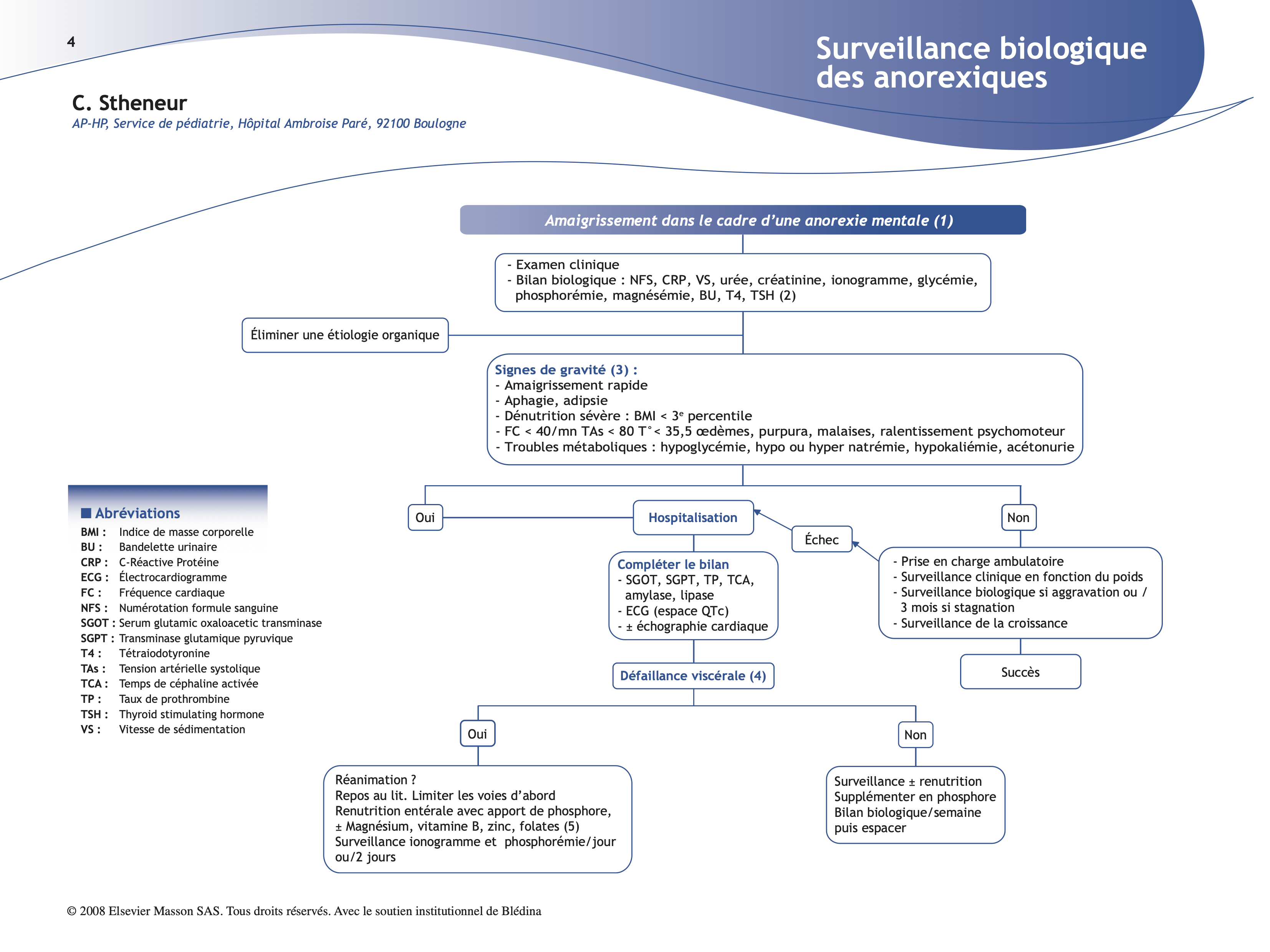 (3) Signes de gravité : les signes de gravité sont, en premier lieu, cliniques. Les perturbations biologiques arrivent dans un deuxième temps. Ces signes dépendent de la rapidité de l’amaigrissement. Un amaigrissement rapide même peu important peut être mal toléré alors qu’un BMI très bas mais ancien peut être à moindre risque immédiat.