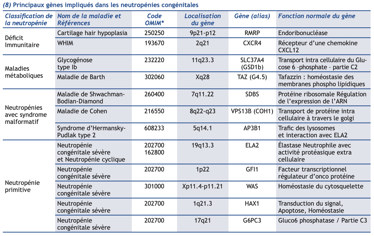 (5) Il est recommandé de se rapprocher d’un service d’hématologie pédiatrique pour le bilan d’une neutropénie sévère, mais aussi pour discuter de la prise en charge thérapeutique au long cours, qui visera à prévenir des infections sévères et une gingivo-stomatite soit par une antibiothérapie prophylactique, soit par des injections de G-CSF.
