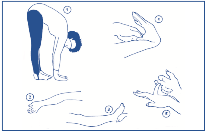 Figure 1. Le score de Beighton prend en compte le degré de mobilité par manœuvre passive sur 5 articulations. La flexion antérieure du tronc, genoux en extension complète, autorise le contact palmaire de la main au sol (1 pt). Hyperextension de coude > 10 ° (1 pt par côté). Hyperextension de genou > 10 ° (1 pt par côté). Apposition du pouce en flexion sur l’avant-bras (1 pt par côté). Dorsiflexion du 5e doigt > 90 ° (1 pt par côté). Le score total est compris entre 0 et 9.