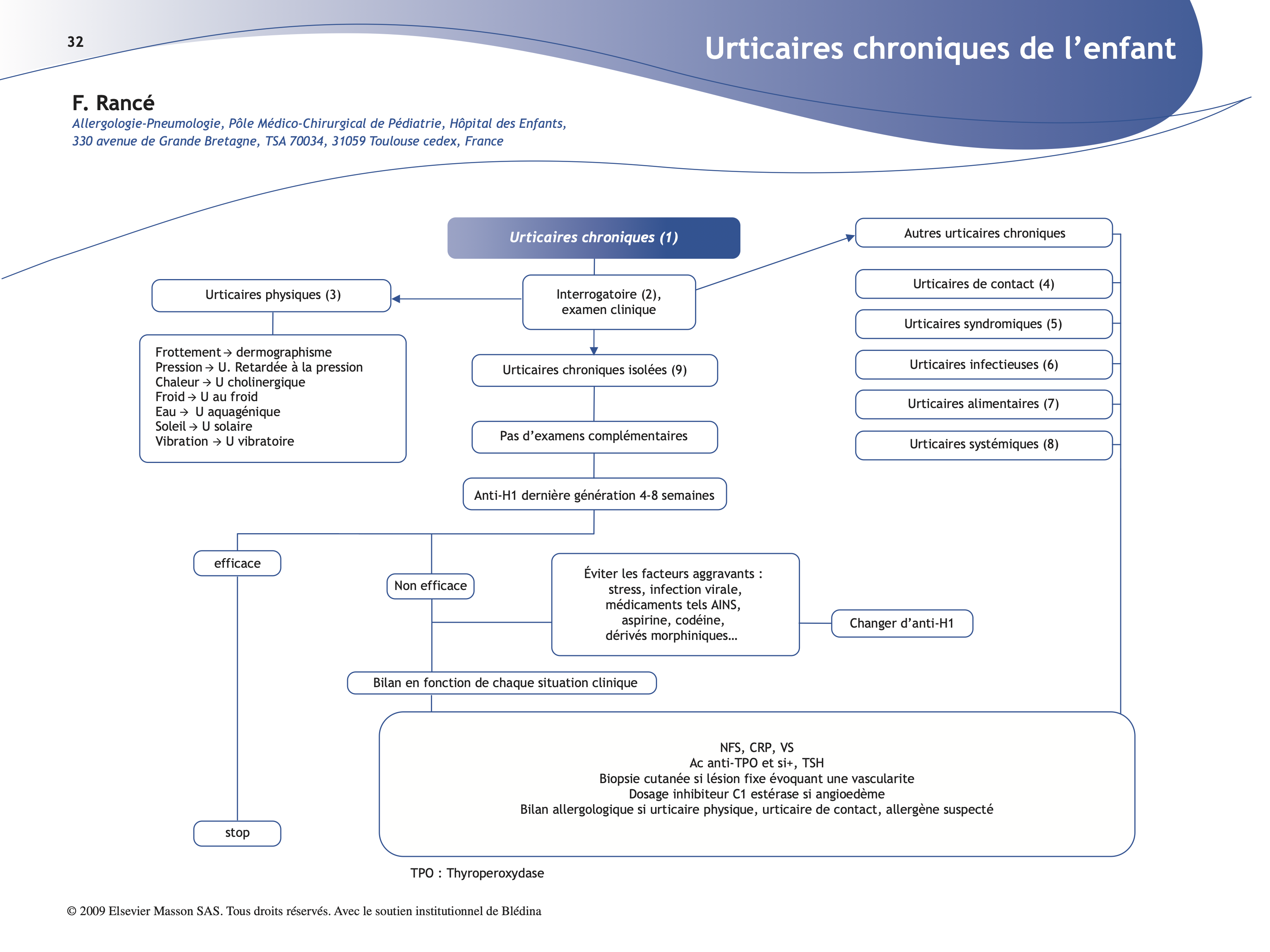 (6) Les urticaires infectieuses sont controversées (toxocarose, Helicobacter pylori, foyers infectieux ORL ou dentaires). Elles ne relèvent pas d’explorations systématiques.