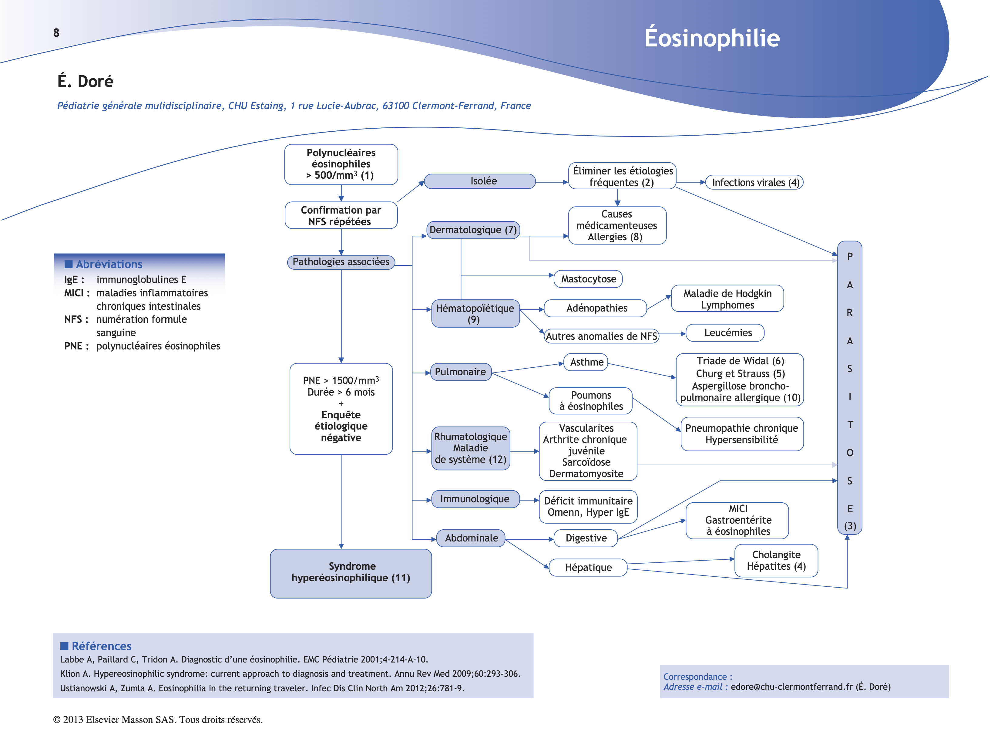 (11) Le syndrome hyperéosinophilique idiopathique est très rare. Il est défini par une hyperéosinophilie > 1 500/mm3, évoluant depuis plus de 6 mois, avec bilan étiologique négatif, malgré l’association à des lésions viscérales diverses (cutanées, cardiaques, hépatiques, pulmonaires, neurologiques, rénales, etc.). Le pronostic est péjoratif et nécessite le recours à des traitements immunosuppresseurs lourds (corticothérapie générale, Glivec®, Hydréa®, Vincristine®, etc.). Une série pédiatrique a retrouvé une atteinte cardiaque fréquente (16 cas sur 18 avec morbi- mortalité élevée, par nécrose puis fibrose myocardique).