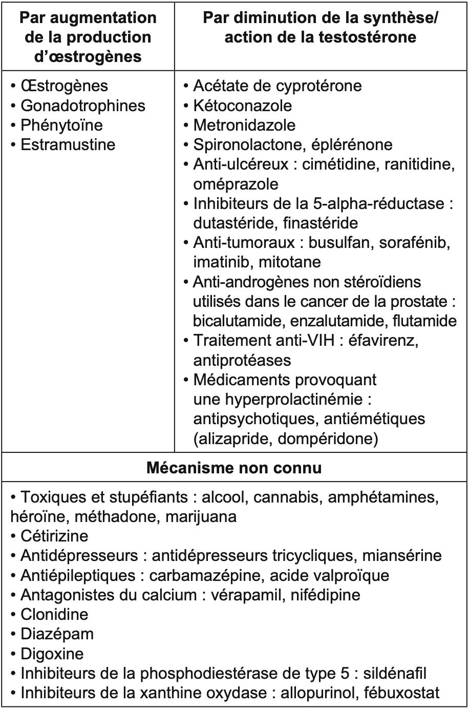 Tableau 1. Liste des médicaments, toxiques ou topiques locaux associés à une gynécomastie (liste non exhaustive).