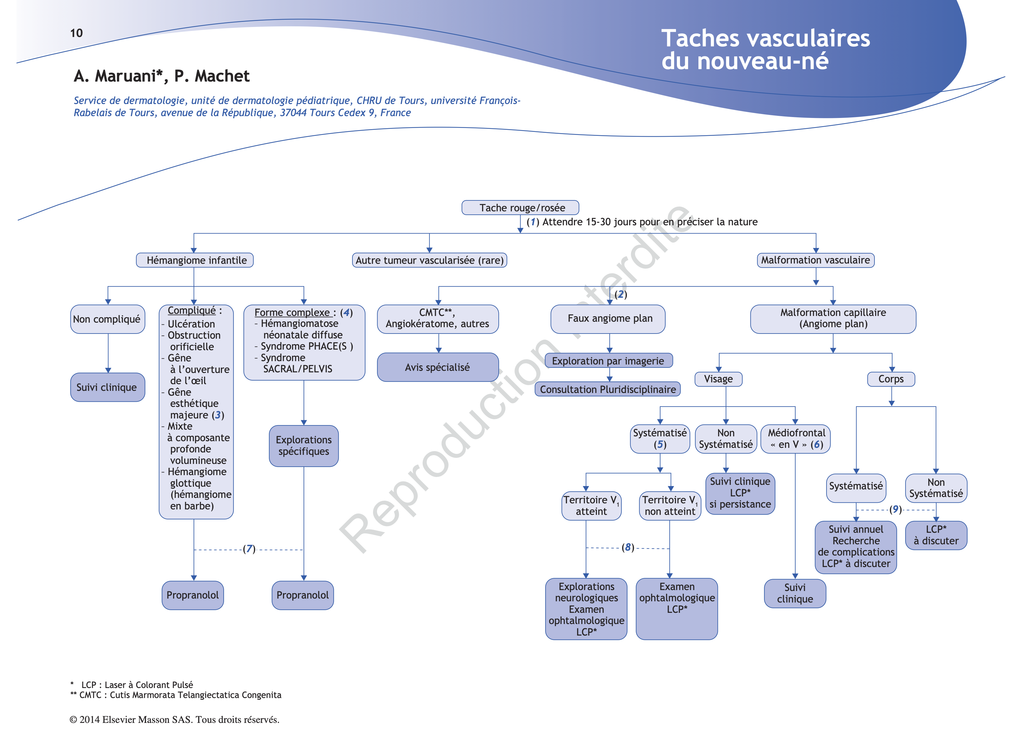 (8) La présence d’un angiome plan systématisé du visage avec atteinte du territoire V1 impose de rechercher un syndrome de Sturge-Weber, par un examen ophtalmologique (à la recherche de glaucome par angiomatose choroïdienne surtout), et neurologique (EEG pour dépister des convulsions, qui sont précoces, et IRM cérébrale vers l’âge de 3-9 mois de vie, pour visualiser un éventuel angiome leptoméningé). Un examen ophtalmologique seul est recommandé en cas d’atteinte du V2 sans V1, des cas avec glaucome ayant été rapportés.