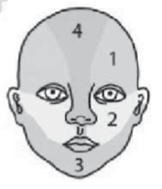 (5) Ci-dessous, un schéma de la segmentation du visage (1 : territoire cutané de la branche ophtalmique du nerf trijumeau (V), 2 : territoire cutané de la branche maxillaire du nerf V, 3 : territoire cutané de la branche mandibulaire du nerf V, 4 : zone médiofrontale).