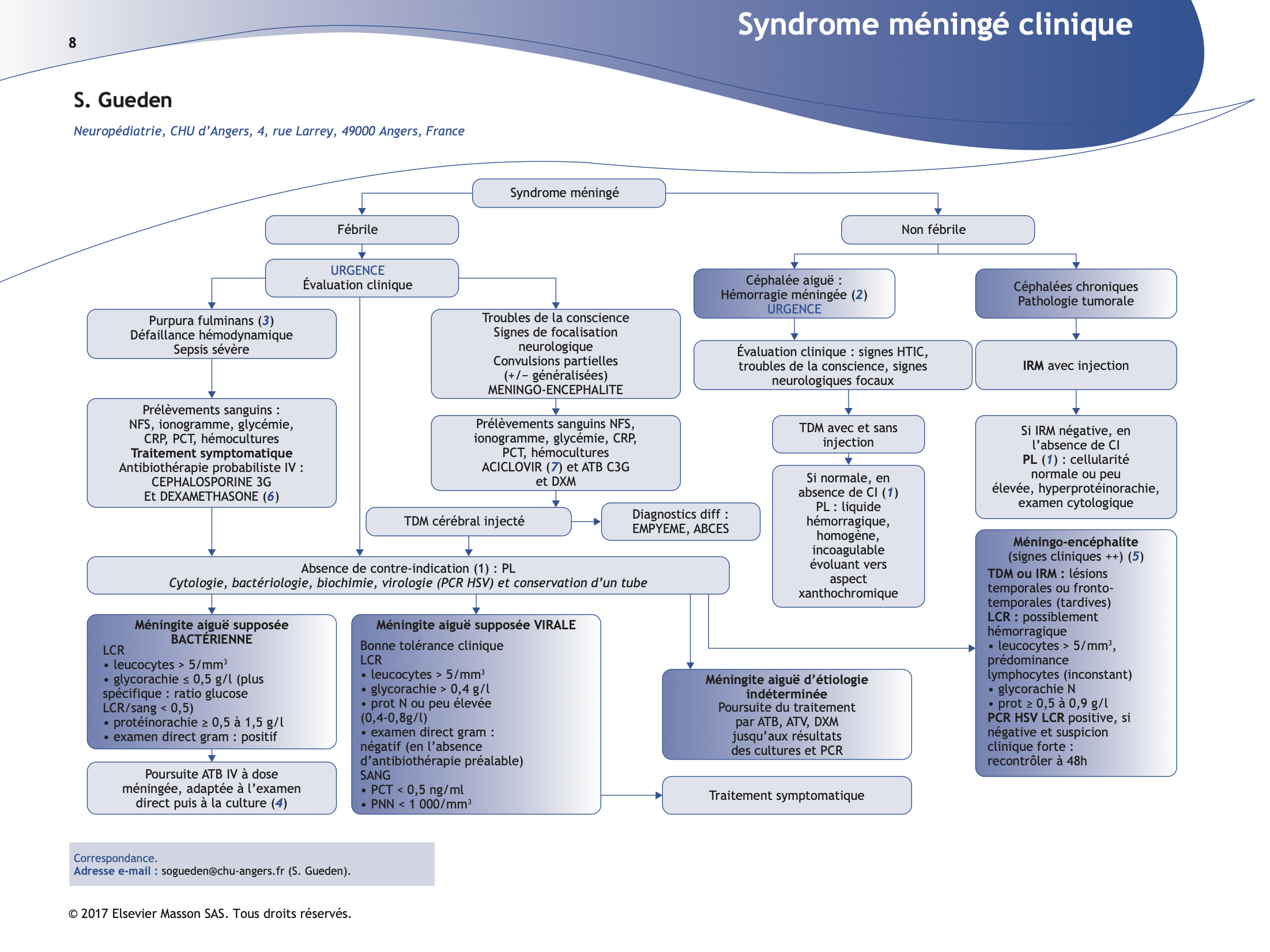 Le syndrome méningé se définit par l’ensemble des symptômes qui témoignent d’une irritation des méninges. Ceux-ci associent habituellement des céphalées intenses et diffuses, une photophobie, des vomissements, une rachialgie. L’examen met en évidence une raideur de nuque, les signes de Kernig et de Brudzinski. Il existe des formes frustes, certains symptômes peuvent être absents, notamment chez le nourrisson de moins de 1 an, où la raideur de nuque est souvent absente ; l’interrogatoire retrouve une irritabilité, des geignements, une hyperesthésie, une douleur aux mobilisations, et plus spécifiquement une hypotonie axiale et une fontanelle bombante. Les convulsions sont fréquentes.