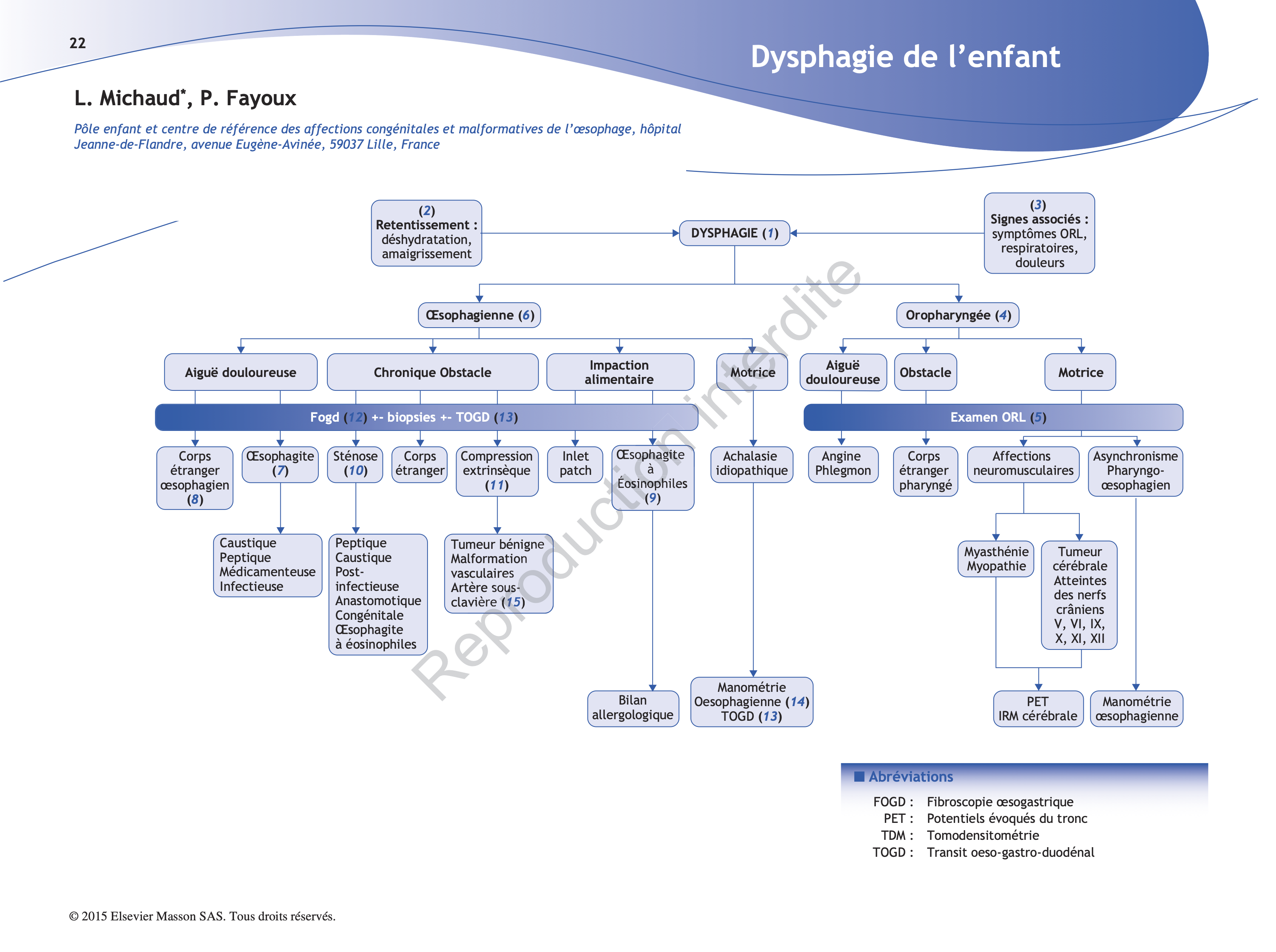 (4) Les dysphagies hautes ou oropharyngées résultent de troubles dès les premiers temps de la déglutition et du phénomène réflexe pharyngo-laryngo-œsophagien. L’origine peut être liée à une atteinte de la motricité ou de la sensibilité bucco-pharyngo-laryngée, ou à un trouble de la coordination. Les symptômes surviennent habituellement dès les premiers temps de la déglutition et peuvent associer des bocages alimentaires et des fausses-routes.