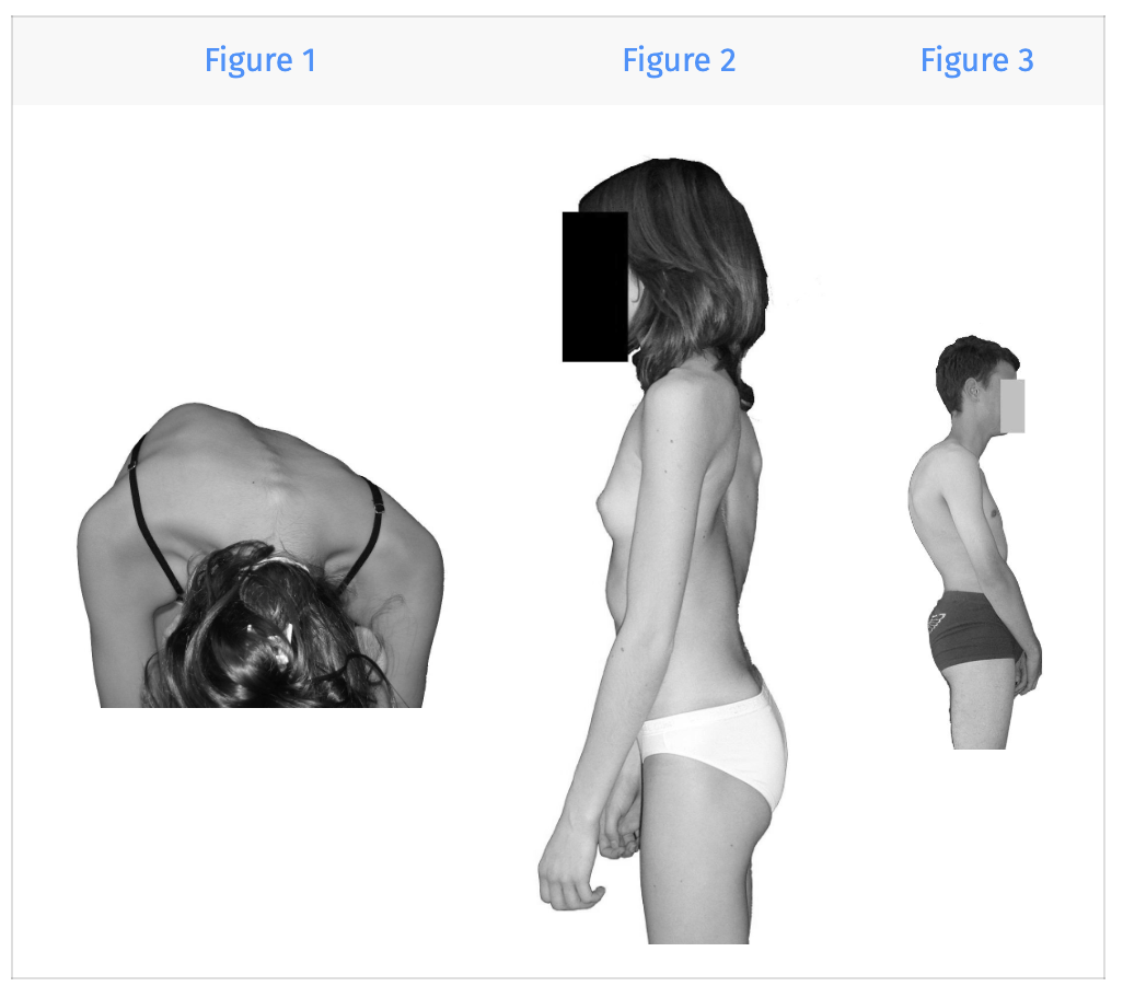 (1) Antéflexion du patient : lors de l’examen, après avoir inspecté l’enfant de face, de dos et de profil (le détail sera indiqué plus bas), on lui demande de se pencher en avant, les mains jointes, après avoir veillé à l’équilibre du bassin (cale éventuelle sous le pied du coté court). Trois options sont possibles : le rachis est raide (distance mains-sol supérieure à 40 cm), il est souple et présente une gibbosité, il est souple sans gibbosité. Noter que l’on a délibérément écarté la question de la symptomatologie fonctionnelle. Les douleurs sont fréquemment rapportées (18 % dans une population d’adolescents) mais sont rarement d’origine organique. En outre, elles ne ont spécifiques d’aucune pathologie organique décrite ci-dessous. Chacune de ces pathologies peut être indolente.