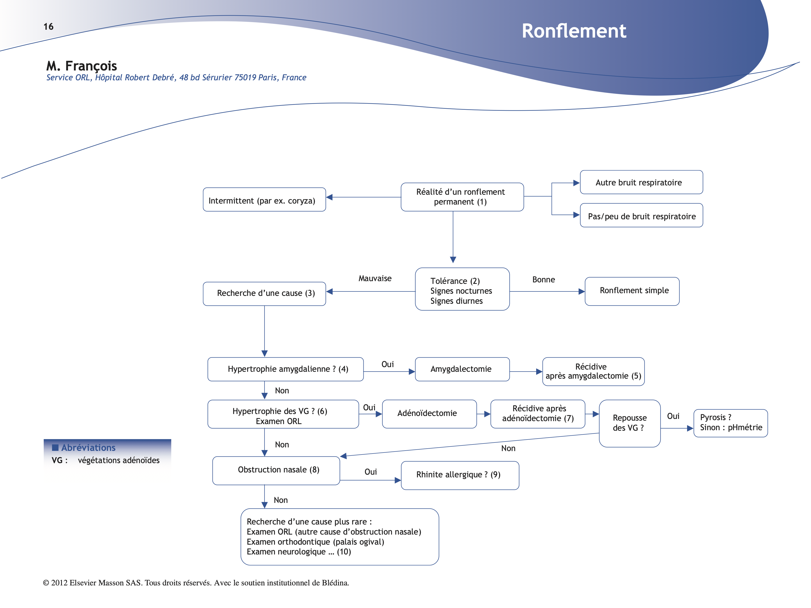 (7) Pas d’abonnement à l’adénoïdectomie : en cas de repousse des végétations après adénoïdectomie, il faut rechercher une cause et la traiter (il s’agit bien souvent d’un reflux gastro-œsophagien [5]). Inversement pas de pH-métrie avant une (première) adénoïdectomie car ces RGO responsables d’hypertrophie adénoïdienne sont rares.