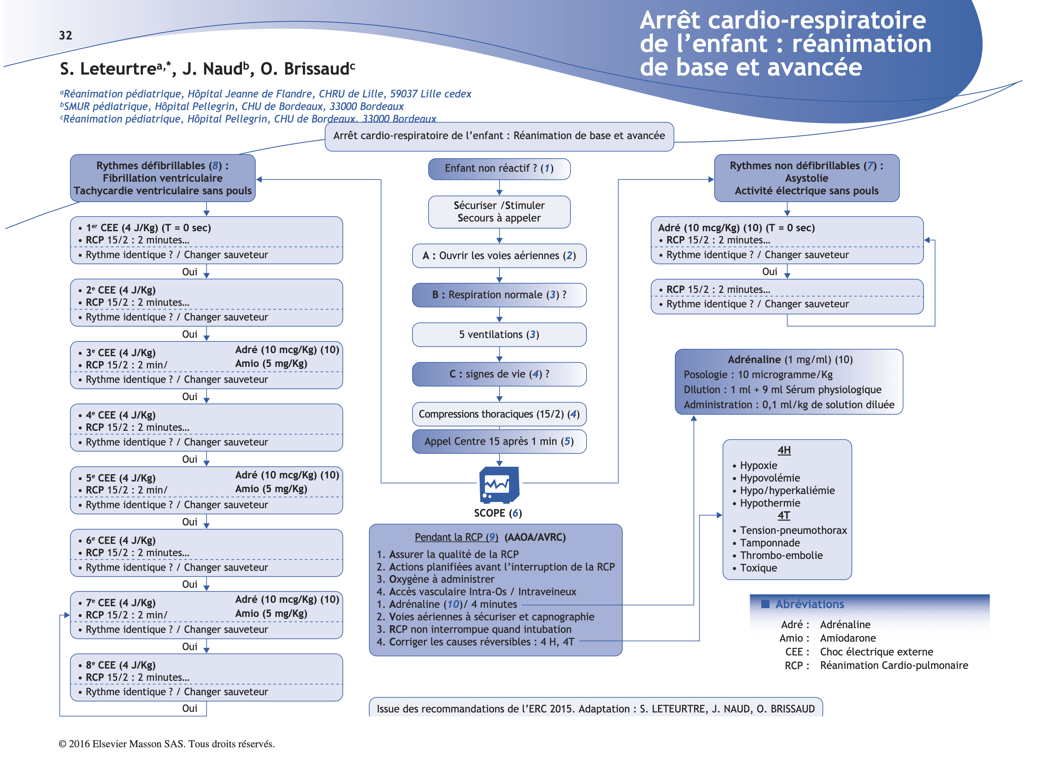 (9) Actions durant la RCP avancée : durant la réanimation avancée, le contrôle de voies aériennes doit être effectué ainsi que la recherche des étiologies curables (4 H : Hypoxie, Hypovolémie, Hypo/Hyper-kaliémie-métabolique, Hypothermie ; 4 T : Tamponnade, Tension-pneumothorax, Thrombo-embolie, Toxiques). Considération éthiques et générales : en fonction du contexte, après 20 min de réanimation, le chef d’équipe doit s’interroger sur l’intérêt de poursuivre la réanimation. La présence des parents pendant la réanimation est encouragée, lorsque l’un des membres dédié de l’équipe peut rester à leur côté. L’équipe médicale et paramédicale doit pouvoir bénéficier d’un débriefing à l’issue de la réanimation. Un retour en circulation spontanée impose des soins post-réanimation spécifiques et de qualité (évaluation selon la méthode ABCDE, contrôle de l’oxygénation et de la ventilation, recherche et correction d’étiologies, contrôle de la température).