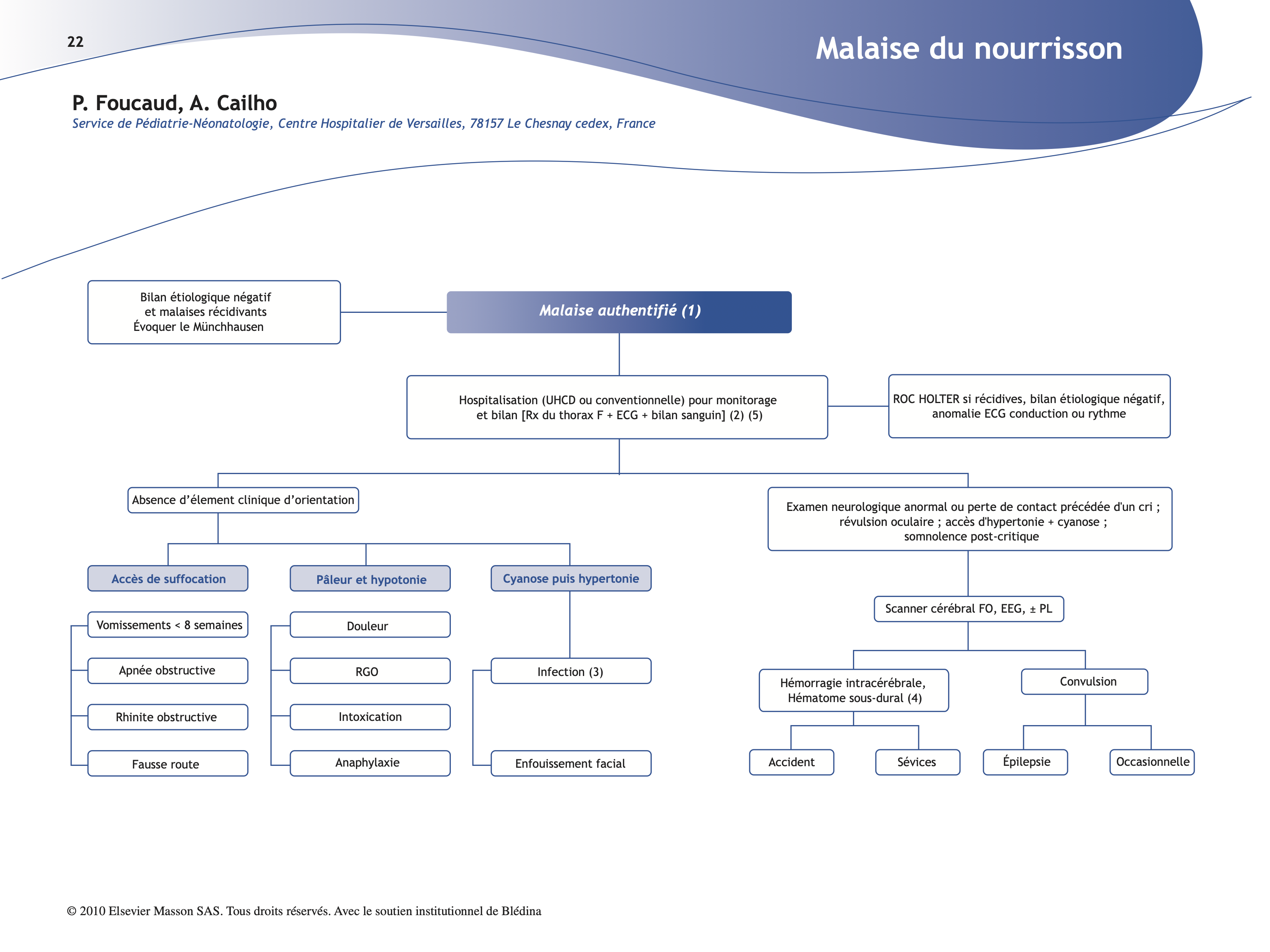 (1) Le malaise du nourrisson est un accident inopiné et brutal, responsable de modifications du tonus et/ou de la coloration des téguments avec ou sans apnée ou perte de connaissance. Il s’agit essentiellement d’enfants de moins de 6 mois, plus souvent durant l’hiver. Ce symptôme génère régulièrement une grande anxiété familiale avec impression de mort imminente. Sa gravité est appréciée par des critères objectifs lors du bilan initial : hypoxie, acidose, lyse cellulaire, ischémie myocardique, convulsions. Le malaise vient révéler des étiologies très diverses, le plus souvent bénignes. Trop longtemps, il a été assimilé à une forme avortée de mort subite. La chute de l’incidence annuelle de cette dernière, après qu’aient été identifiés les facteurs déclenchants au cours du sommeil, a fait évoluer la prise en charge du malaise comme une entité à part entière. La première étape doit être d’authentifier l’accident, de faire la part entre physiologie et pathologie. Certains « pseudo-malaises » viennent révéler des anxiétés infondées, voire des dépressions masquées du post-partum.