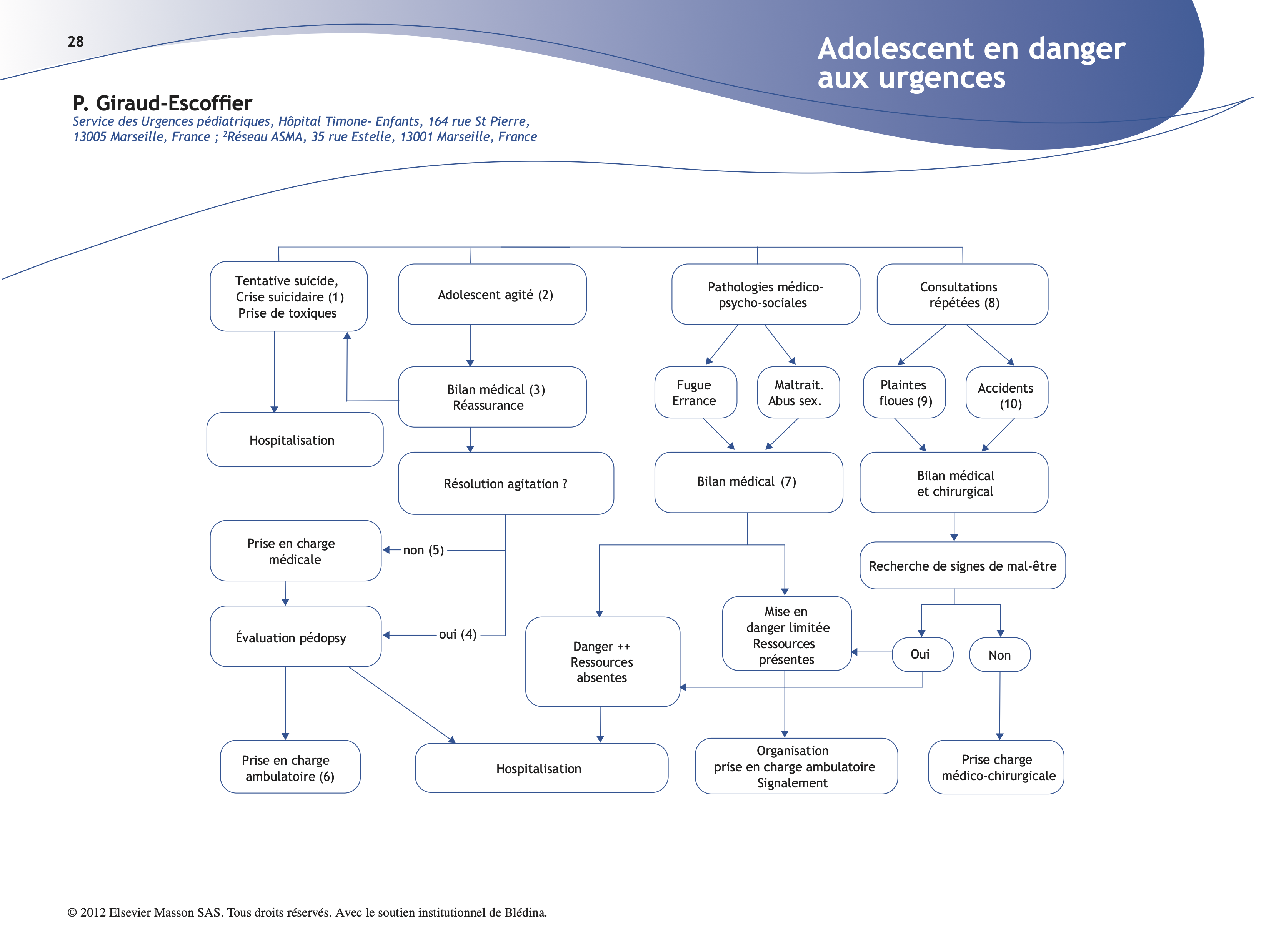 Il est difficile de lister toutes les façons pour un adolescent de se présenter aux urgences dans une situation de danger. Nous avons ici tenté de recenser les situations les plus courantes. Nous avons pris le parti d’écarter de ce « Pas à Pas » les adolescents présentant une pathologie psychiatrique avérée pour lesquelles l’appel au pédopsychiatre se fait souvent d’emblée (après avoir éliminé une cause organique) et les situations de danger purement médicales pour lesquelles des « Pas à Pas » spécifiques sont déjà écrits ou vont l’être.