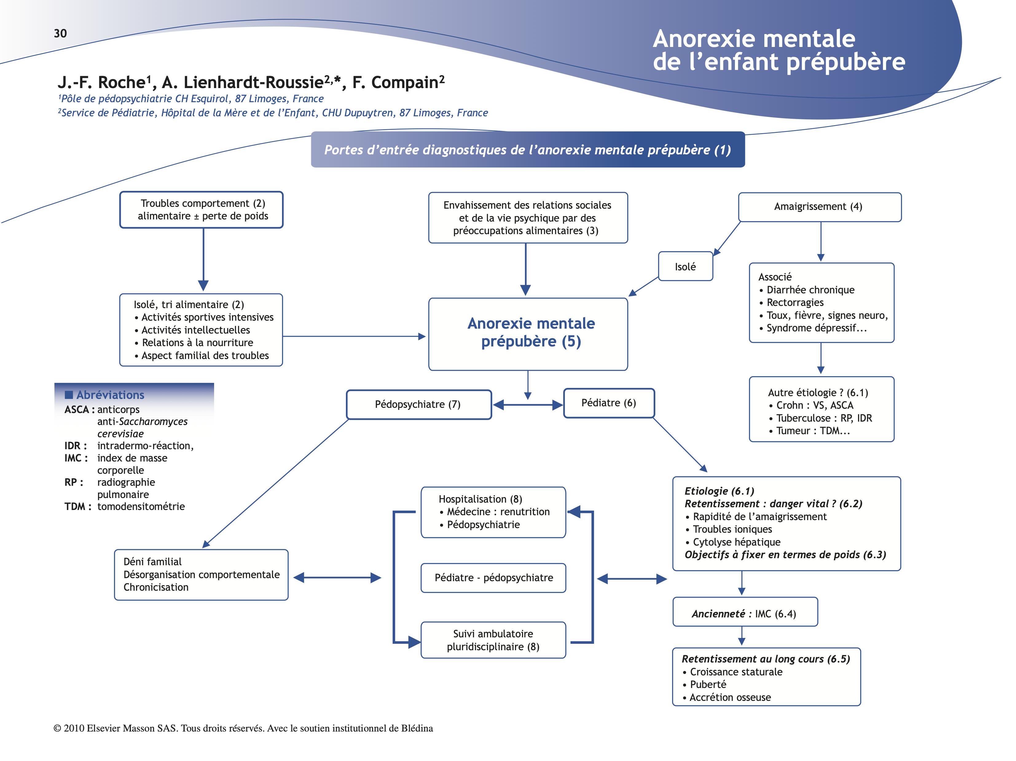 (1) Diagnostic : Les portes d’entrée dans le diagnostic d’anorexie mentale prépubère ne sont pas la triade classique amaigrissement-anorexie-aménorrhée, mais plus volontiers des troubles du comportement alimentaire, des troubles psychologiques, un amaigrissement. Il faut se méfier d’une préadolescente qui a débuté sa puberté et qui présente une régression du développement mammaire (diagnostic différentiel : adénome à prolactine, tumeur sellaire).
