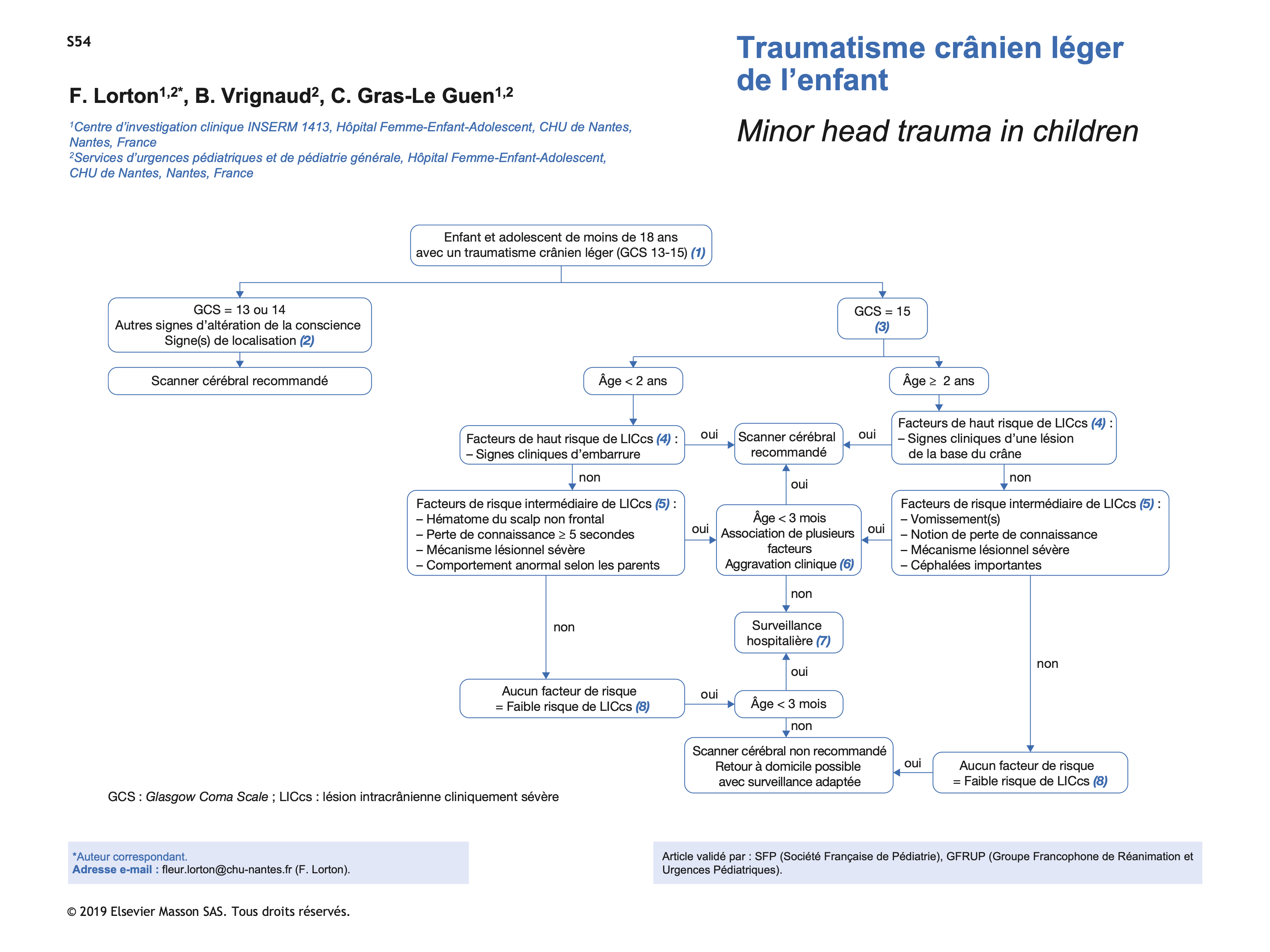(1) Un TCL de l’enfant est défini par un GCS compris entre 13 et 15. La RDC n’est pas applicable aux enfants avec des troubles de la coagulation, des troubles neurologiques antérieurs au TC, une dérivation ventriculaire, un antécédent de tumeur cérébrale, un TC pénétrant ou en cas de suspicion de TC infligé.