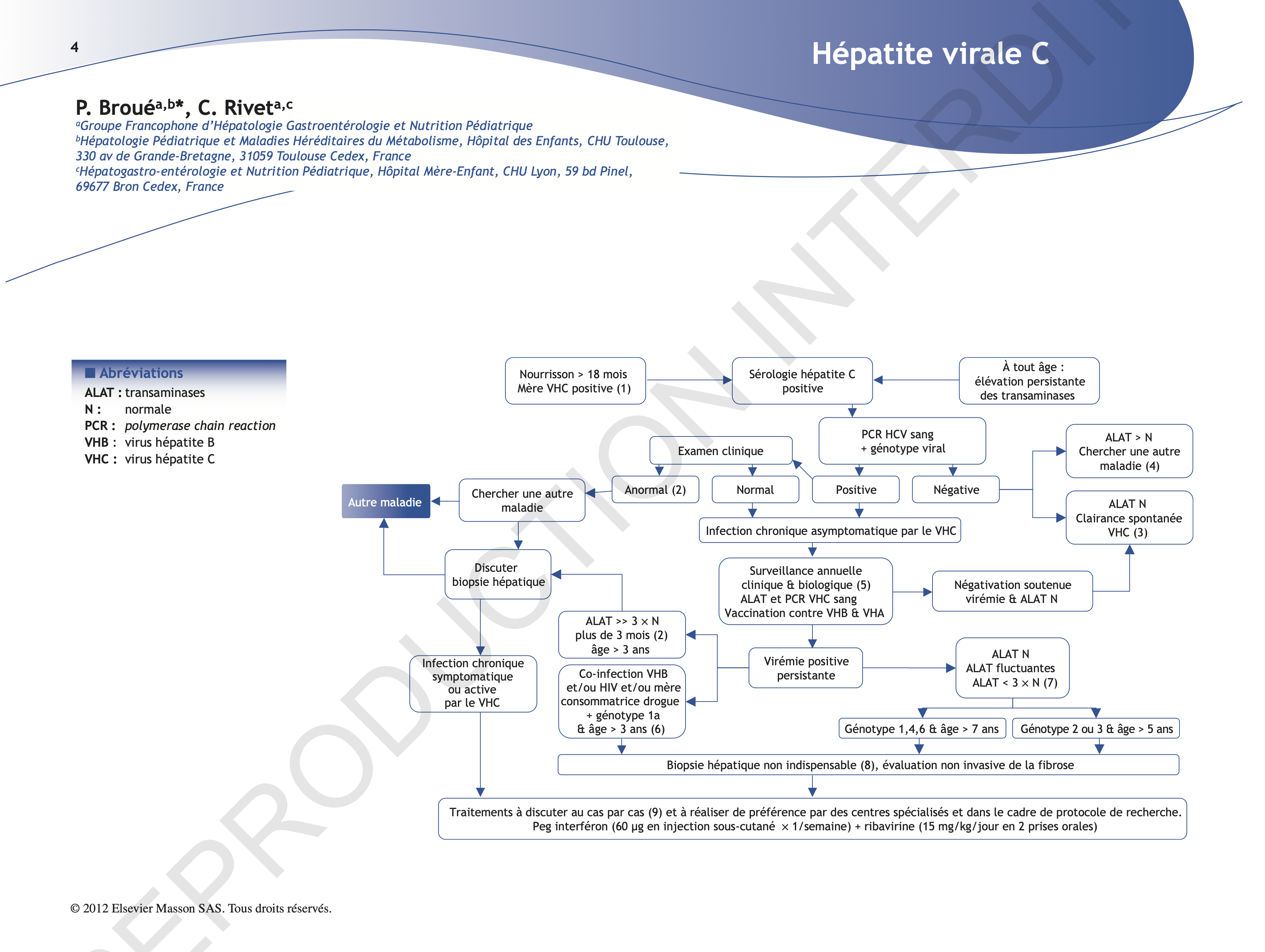 (6) L’existence d’une co-infection par le virus de l’hépatite B, le virus VIH, ou le fait que la mère soit consommatrice régulière de drogues avec un VHC génotype 1a ont été identifiés comme des facteurs pouvant accélérer la vitesse de formation de fibrose et s’associer à un risque de cirrhose en période pédiatrique [1].