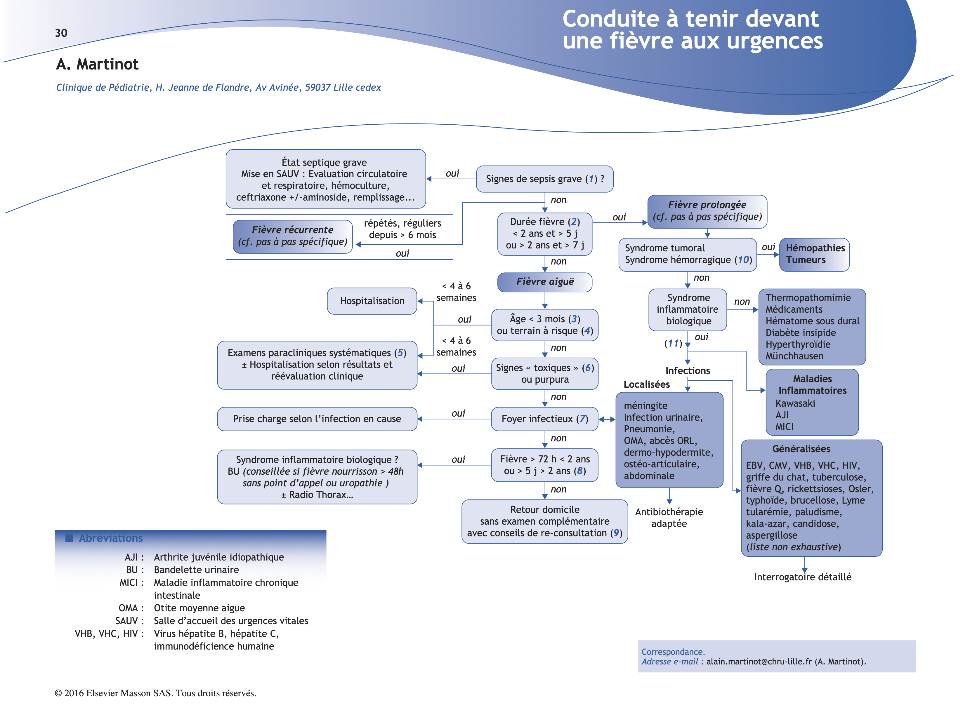 Le diagnostic d’une fièvre nécessite de distinguer les fièvres aiguës, prolongées et récurrentes. Les fièvres récurrentes ne sont pas ici détaillées (cf pas à pas spécifique) mais sont évoquées en cas d’épisodes fébriles réguliers, souvent stéréotypés survenant depuis au moins 6 mois. Les fièvres au retour d’un pays tropical ont également été traitées par ailleurs ainsi que les situations particulières de la drépanocytose et des cardiopathies.