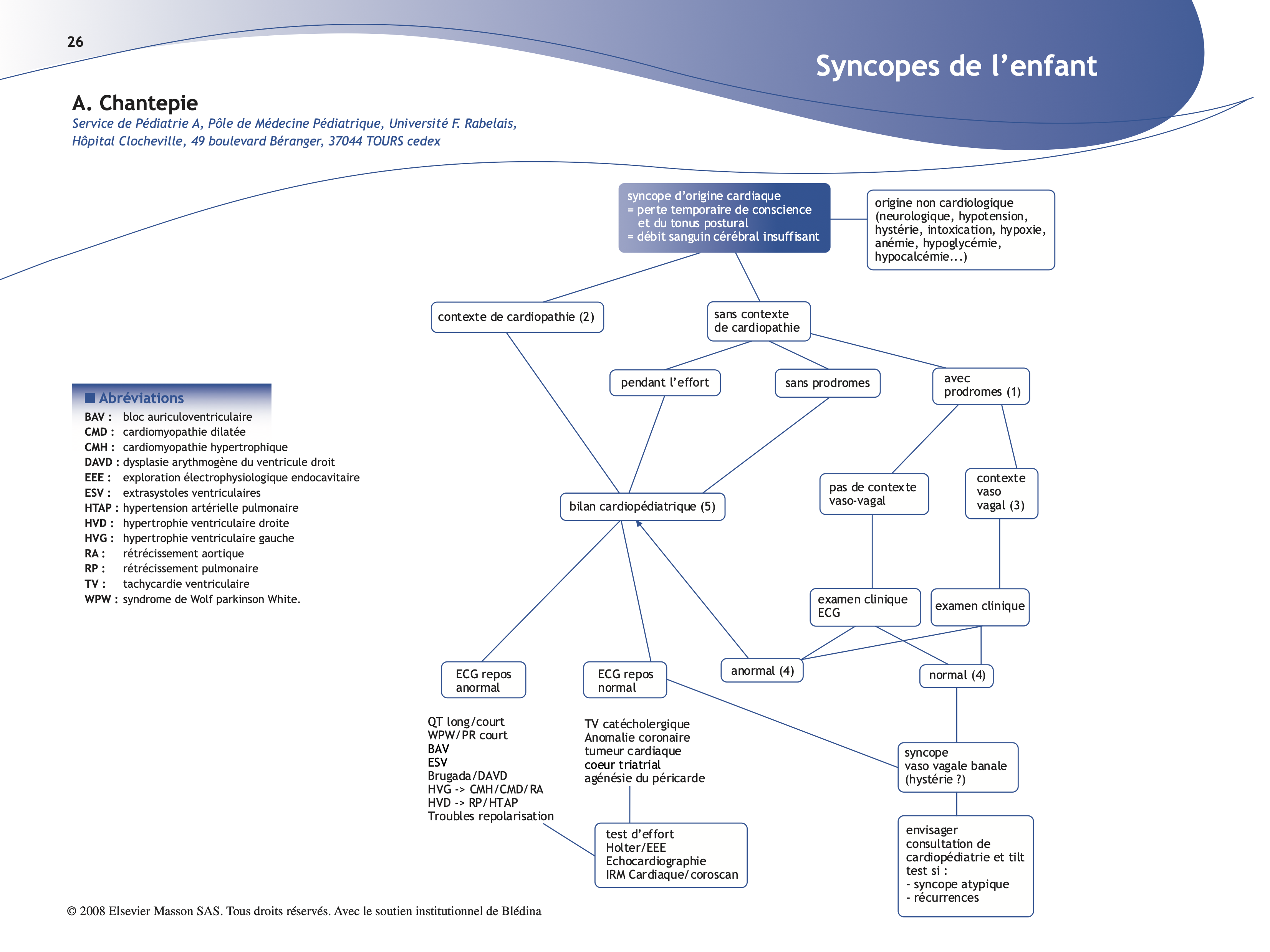 (5) Bilan cardiologique : il comporte un ECG (électrocardiogramme) et une échocardiographie, puis, en fonction de l’orientation étiologique, d’autres examens : test d’effort pour démasquer une arythmie ventriculaire ou une ischémie myocardique, holter de 24 heures pour détecter des troubles du rythme ou de la conduction, une imagerie des artères coronaires par coroscan ou IRM dans l’hypothèse d’un trajet anormal, une imagerie du myocarde par IRM pour identifier une myocardite, une myocardiopathie (myocarde spongieux) ou une dysplasie arythmogène du ventricule droit.