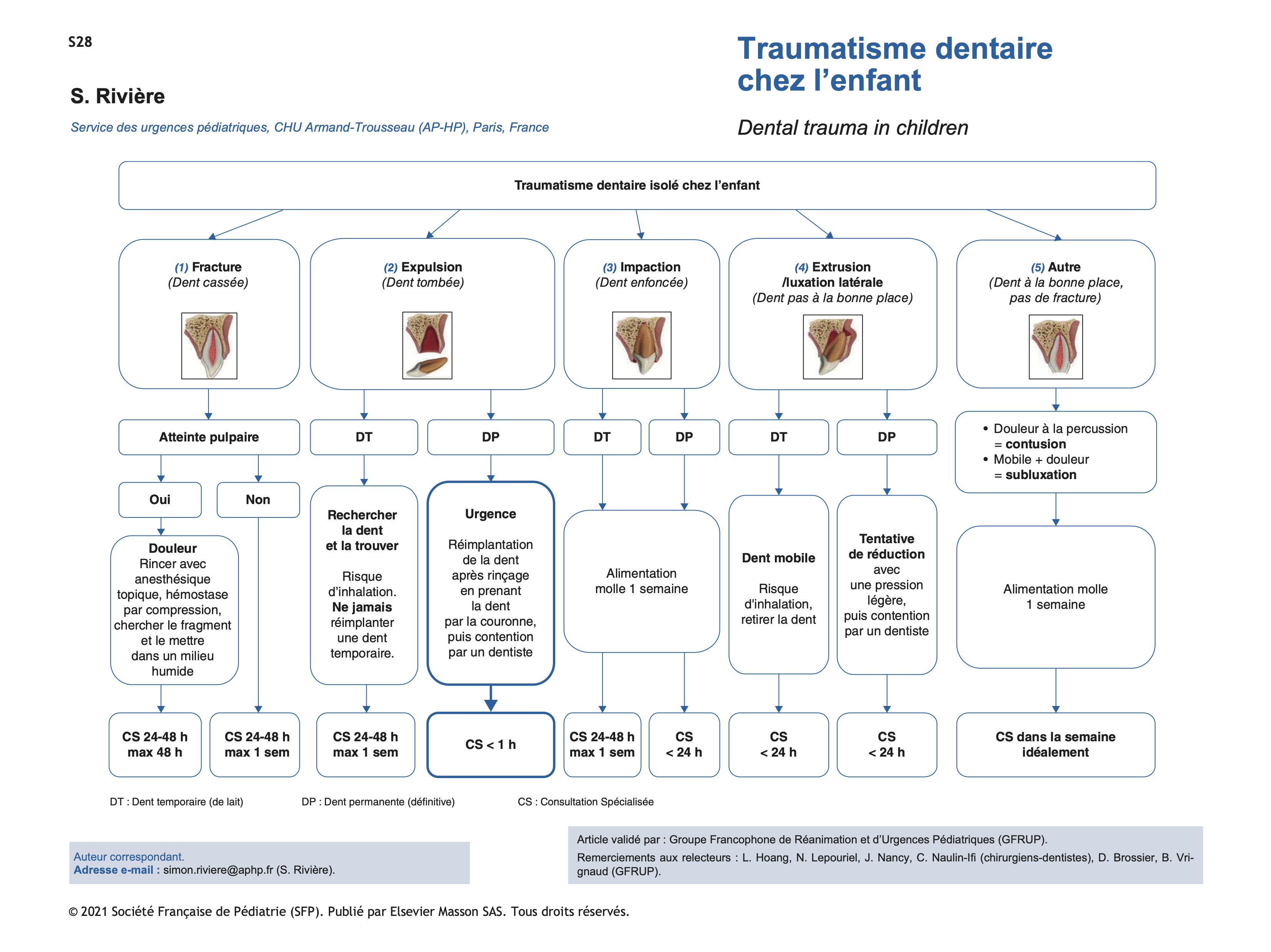 L’objectif de ce pas à pas est de permettre aux pédiatres évaluant un enfant traumatisé dentaire en première ligne de savoir quand adresser au chirurgien-dentiste ou au chirurgien maxillo-facial, et dans quel délai. Il est important que chaque service d’urgence ou cabinet médical identifie localement des partenaires ayant une orientation pédiatrique, ainsi que les modalités d’adressage.