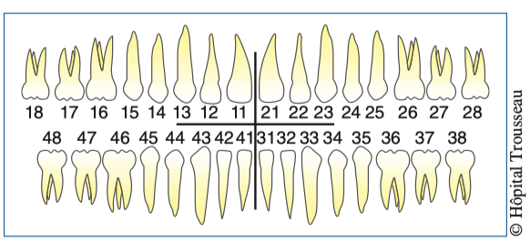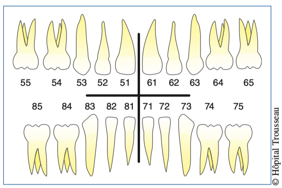 La conduite à tenir diffère selon le type de denture concernée ; il est donc essentiel de connaître la chronologie normale des dentures d’un enfant : 0-5 ans = dents temporaires (DT) uniquement, numérotées de 51 à 85 ; 5-12 ans : denture mixte avec coexistence de dents permanentes et de dents temporaires ; > 12 ans : dents permanentes (DP), numérotées de 11 à 48.