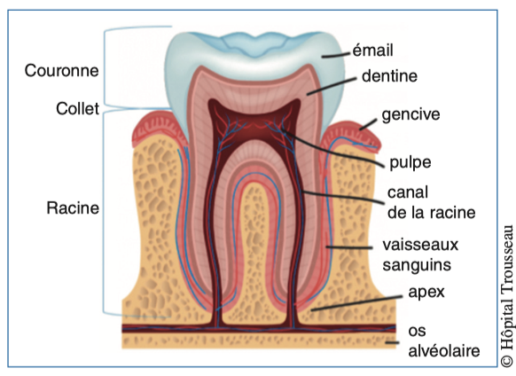 Les DT, dents temporaires ou dents de lait, apparaissent vers 6 mois et chutent à partir de 5-6 ans, avec au total 20 dents, soit 10 par mâchoire, avec de chaque côté (Figure 1) : 1 incisive centrale et 1 latérale, 1 canine et 2 molaires.