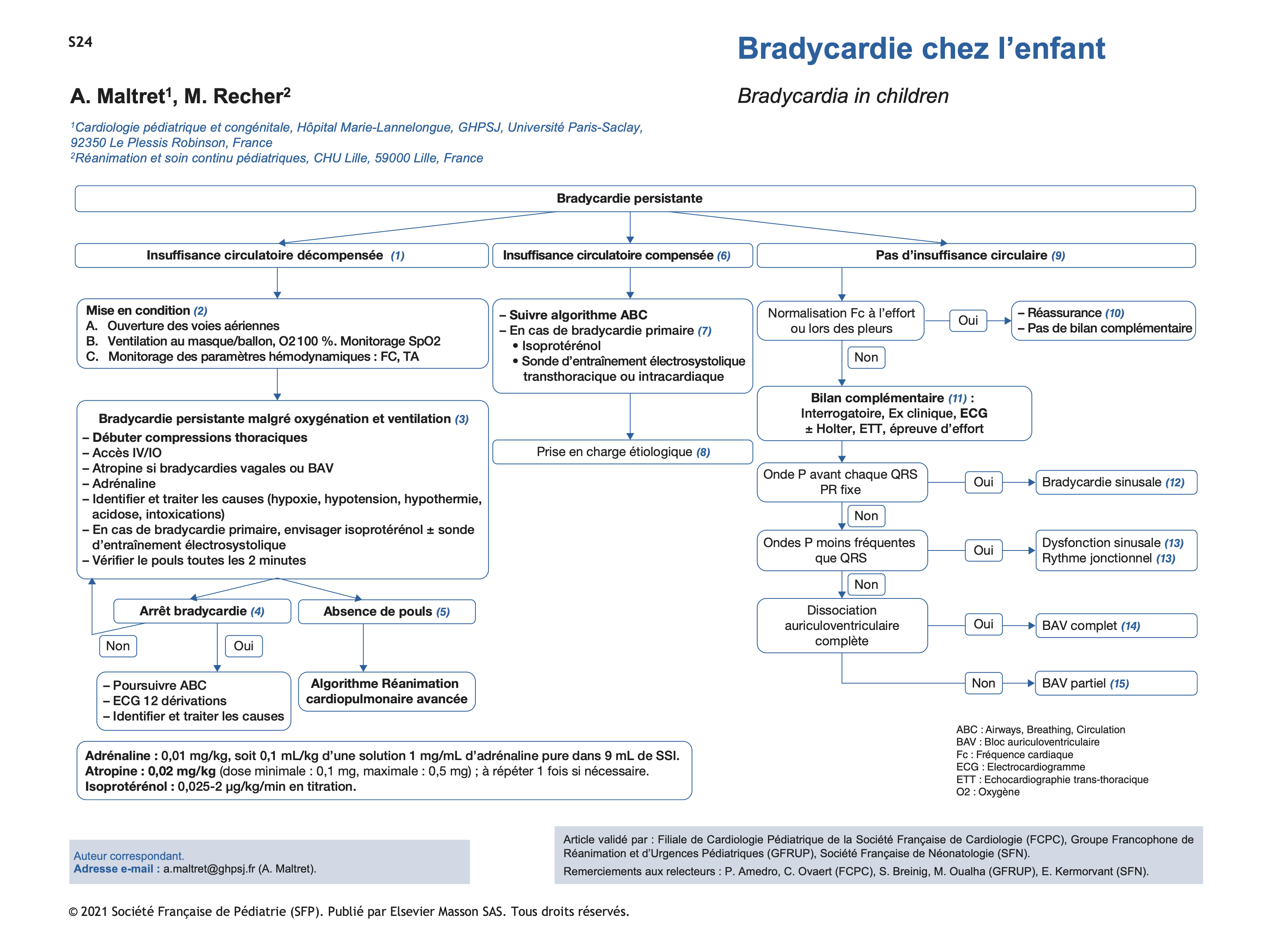 (4) En cas de retour d’un rythme cardiaque normal sinusal adapté à l’âge, poursuivre la prise en charge ABC, réaliser un électrocardiogramme (ECG) 12 dérivations, identifier et traiter les étiologies (voir (8)), demander un avis cardiologique.