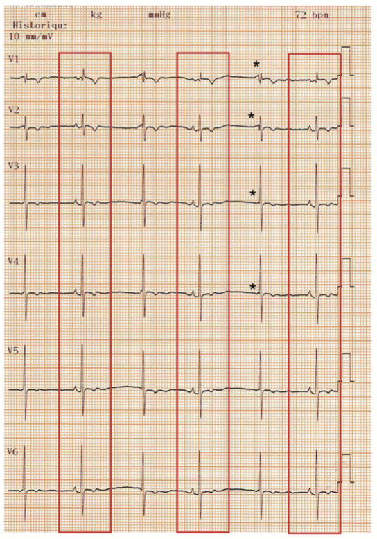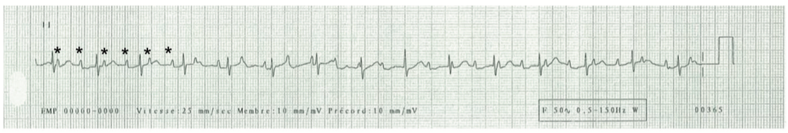 Le tracé est caractérisé par une activité atriale plus nombreuse que l’activité ventriculaire avec une complète dissociation entre l’activité des oreillettes (*) et les QRS.