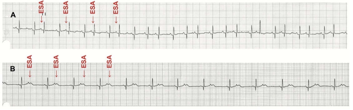A : rythme cardiaque irrégulier chez un nouveau-né en raison d’extrasystoles atriales (ESA) conduites aux ventricules.