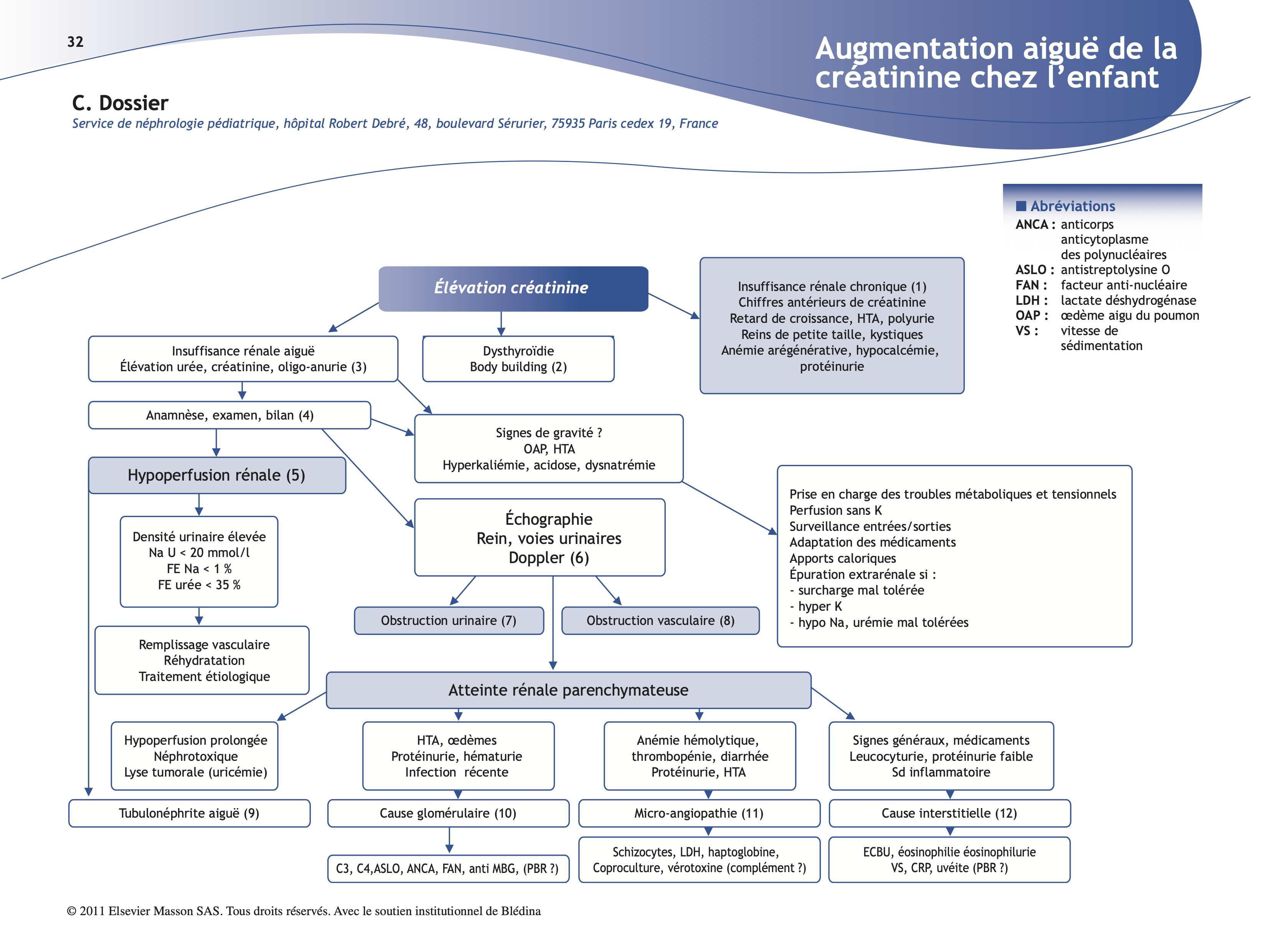 La découverte d’une créatinine élevée (à interpréter en fonction de la masse musculaire) doit conduire à une démarche diagnostique rapide. En effet, l’augmentation de la créatinine traduit un arrêt de la fonction rénale, qui peut être brutal et conduire rapidement à des désordres hydro-électrolytiques pouvant mettre en jeu le pronostic vital (hyperkaliémie, œdème aigu du poumon par surcharge hydrosodée). L’évaluation doit aussi permettre de repérer une insuffisance rénale chronique