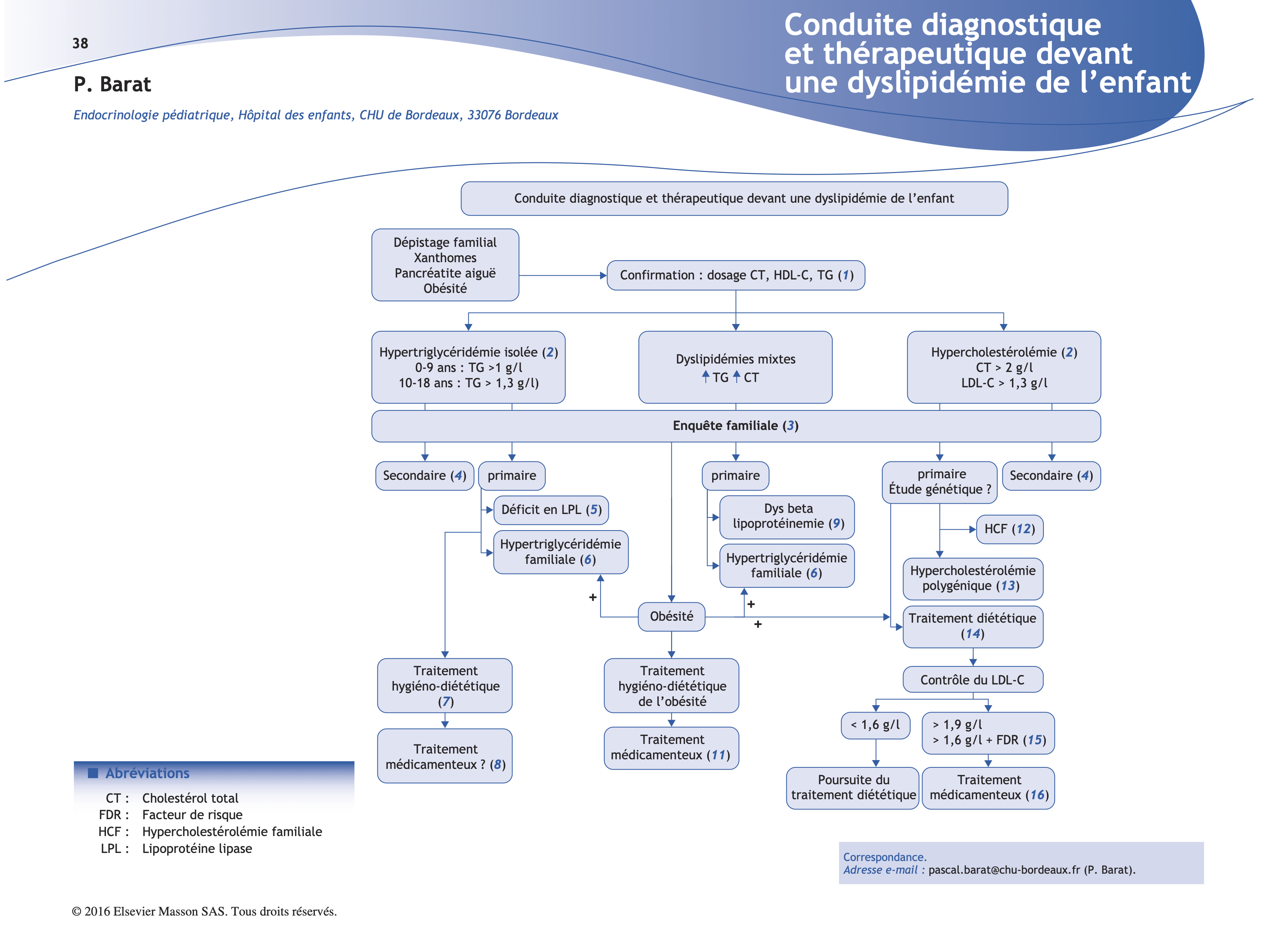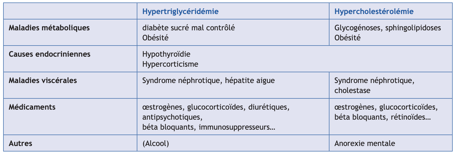 (9) La dysbetalipoprotéinémie est due à une mutation homozygote du gène de l’Apo lipoprotéine E. Son expression chez l’enfant est favorisée par l’obésité, le diabète ou la prise d’œstrogènes. Il s’agit d’une pathologie rare.