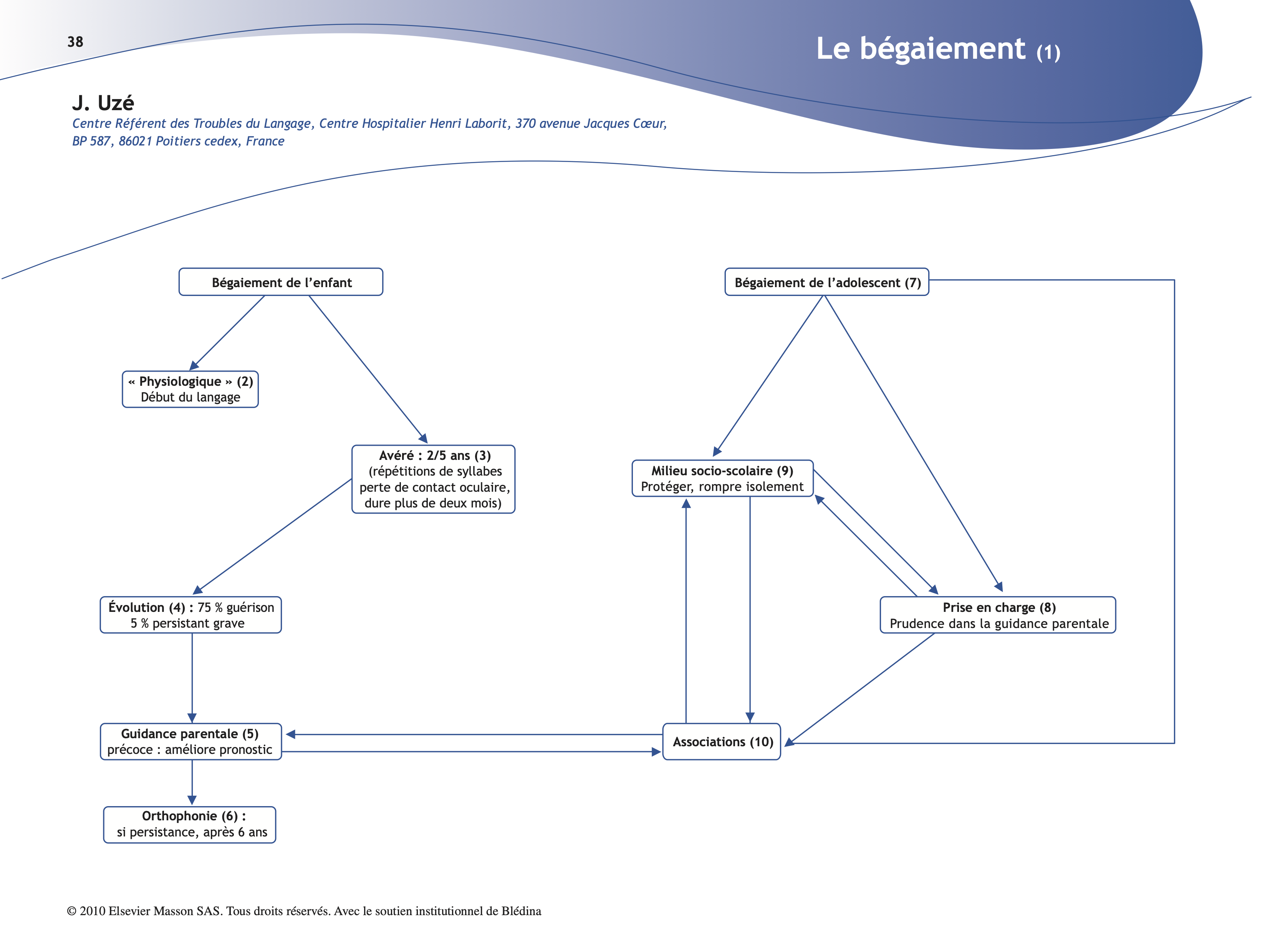(6) La pérennisation des troubles ou l’âge de l’enfant (après 6 ans) doit faire poser l’indication d’une prise en charge spécialisée en orthophonie. Enfin, il existe dans quelques centres hospitaliers des consultations spécialisées dans le bégaiement.