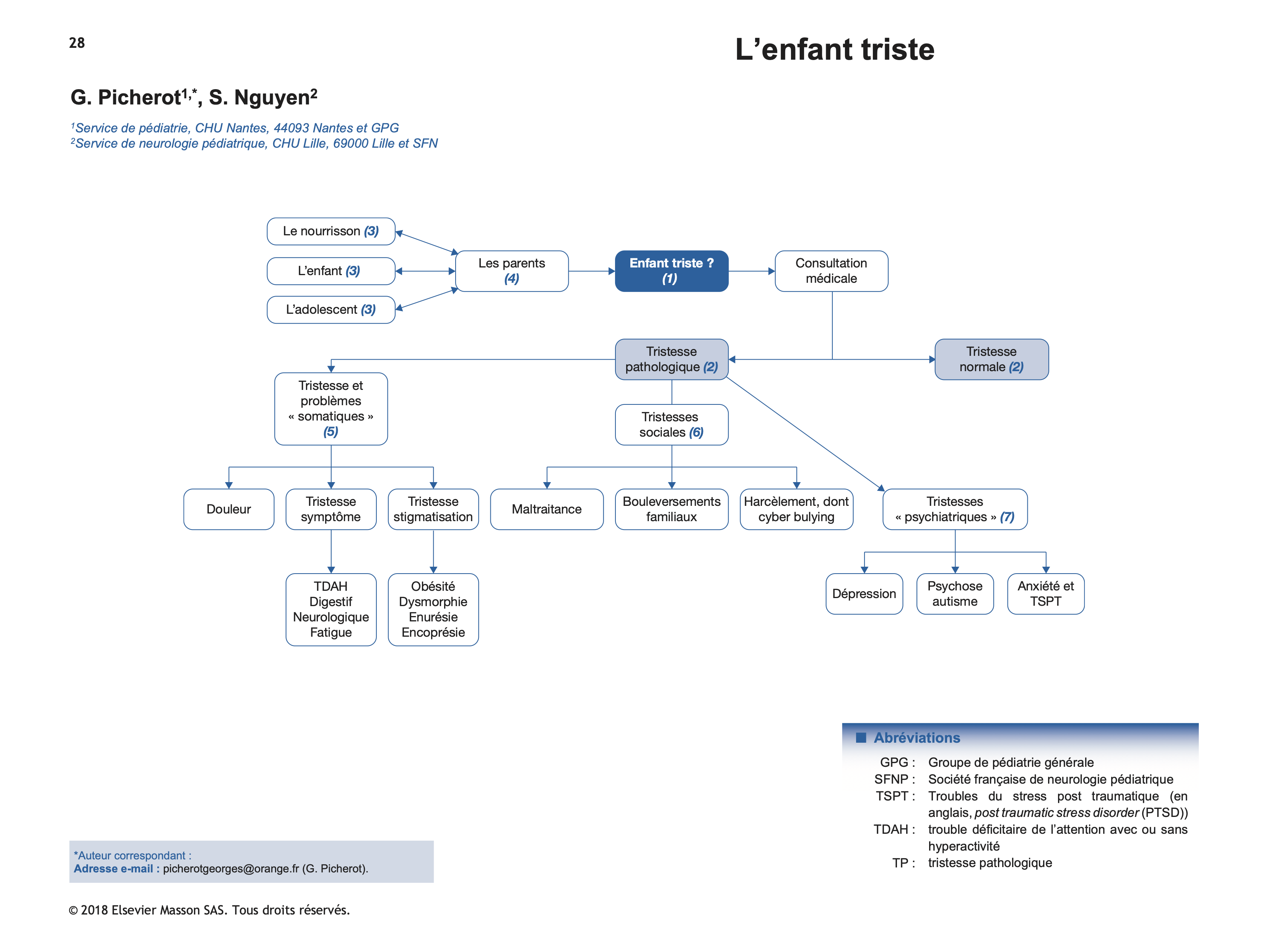 (2) La démarche de ce Pas à Pas concerne la tristesse pathologique (TP) de l’enfant qui amène les parents à une consultation pédiatrique avec ce motif « mon enfant est triste ». Si ce mot tristesse est souvent prononcé, il n’est finalement que très peu retrouvé dans les bibliographies pédiatriques. La limite entre normal et anormal est imprécise. On peut retenir que la tristesse anormale est une tristesse qui dure et entraîne quel que soit l’âge une inquiétude de l’entourage. Lorsqu’elle est pathologique la tristesse est accompagnée d’un retentissement comportemental, social et somatique plus ou moins associés selon les causes de la tristesse.
